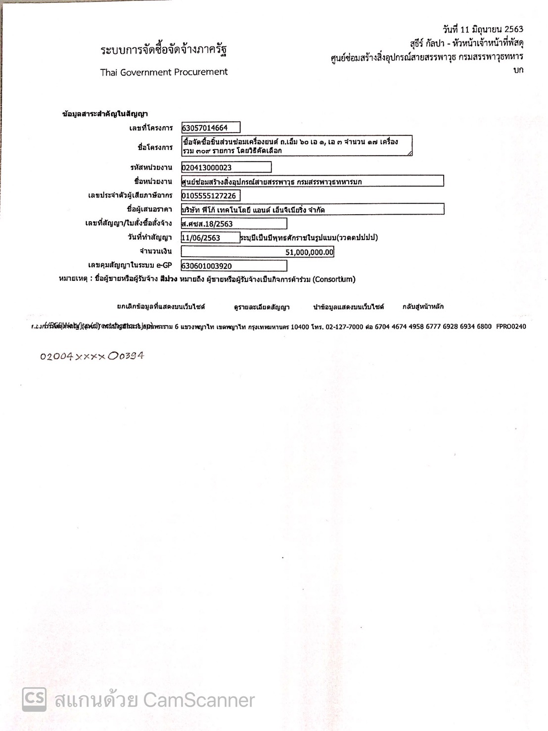 กองทัพบกโดยกรมสรรพาวุธทหารบก ขอประกาศเผยแพร่สาระสำคัญของสัญญาหรือข้อตกลงที่ได้ลงนามแล้วตามเอกสารที่แนบท้ายประกาศนี้