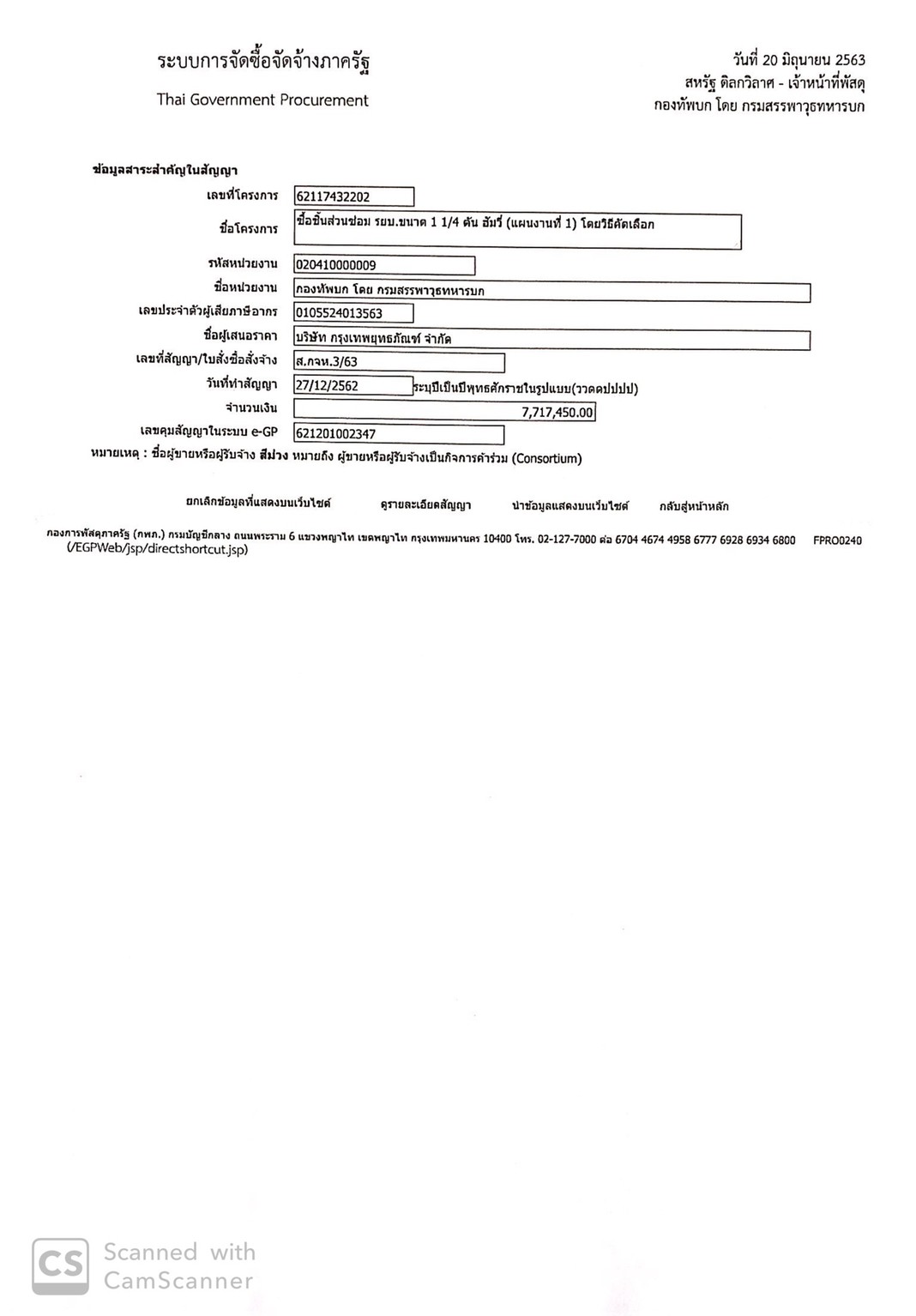 กองทัพบกโดยกรมสรรพาวุธทหารบก ขอประกาศเผยแพร่สาระสำคัญของสัญญาหรือข้อตกลงที่ได้ลงนามแล้วตามเอกสารที่แนบท้ายประกาศนี้