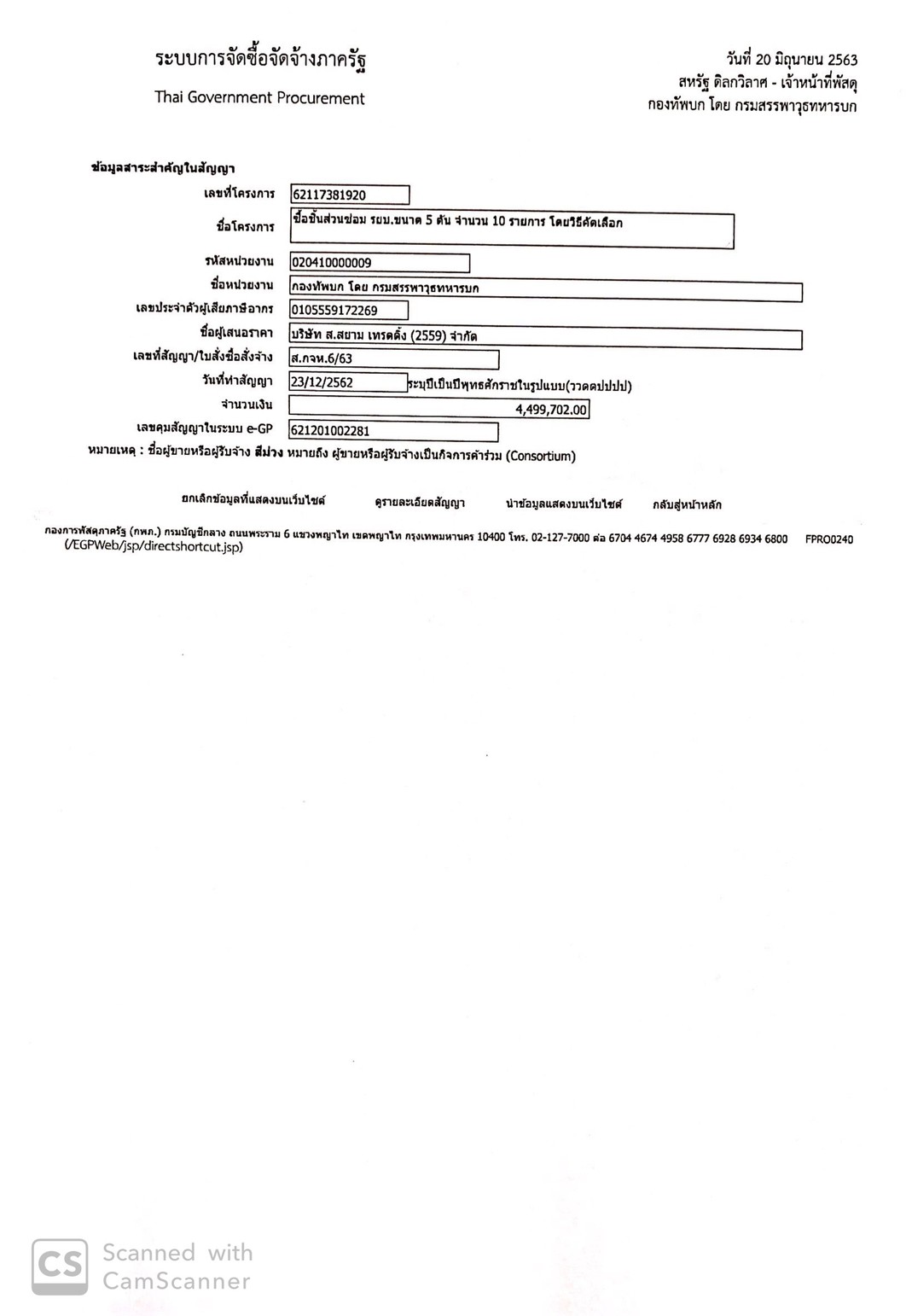 กองทัพบกโดยกรมสรรพาวุธทหารบก ขอประกาศเผยแพร่สาระสำคัญของสัญญาหรือข้อตกลงที่ได้ลงนามแล้วตามเอกสารที่แนบท้ายประกาศนี้