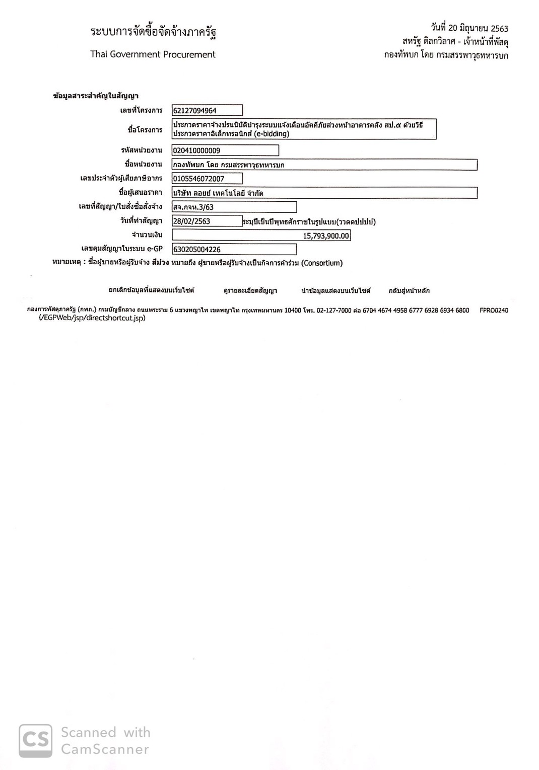 กองทัพบกโดยกรมสรรพาวุธทหารบก ขอประกาศเผยแพร่สาระสำคัญของสัญญาหรือข้อตกลงที่ได้ลงนามแล้วตามเอกสารที่แนบท้ายประกาศนี้