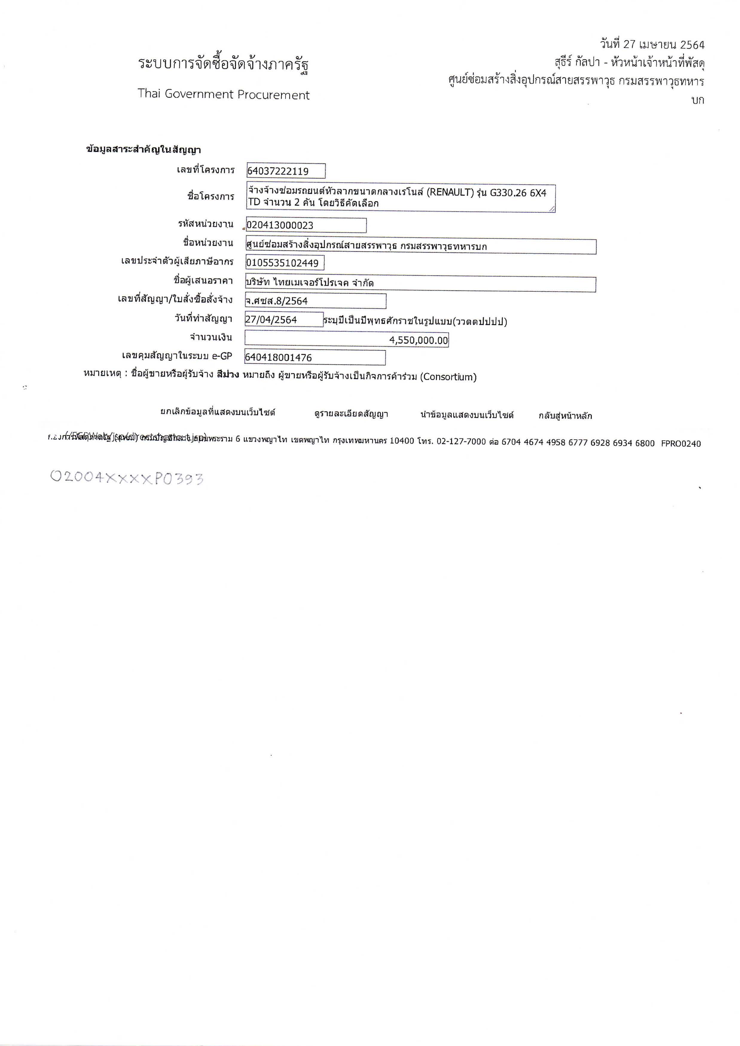 กองทัพบกโดยกรมสรรพาวุธทหารบก ขอประกาศเผยแพร่สาระสำคัญของสัญญาหรือข้อตกลงที่ได้ลงนามแล้วตามเอกสารที่แนบท้ายประกาศนี้