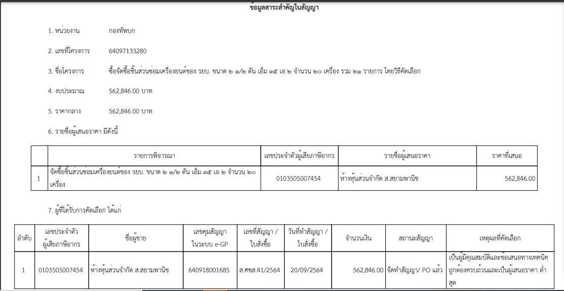 เรื่อง จัดซื้อชิ้นส่วนซ่อมเครื่องยนต์ของ รยบ. ขนาด ๒ ๑/๒ ตัน เอ็ม ๓๕ เอ ๒ จำนวน ๒๐ เครื่อง รวม ๒๑ รายการ โดยวิธีคัดเลือก