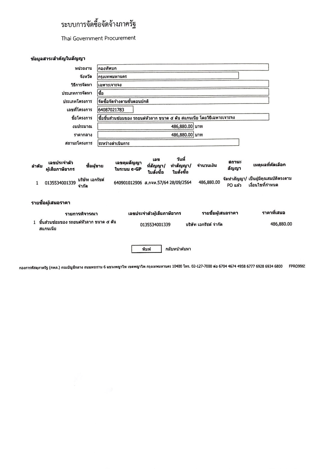 กองทัพบกโดยกรมสรรพาวุธทหารบก ขอประกาศเผยแพร่สาระสำคัญของสัญญาหรือข้อตกลงที่ได้ลงนามแล้วตามเอกสารที่แนบท้ายประกาศนี้