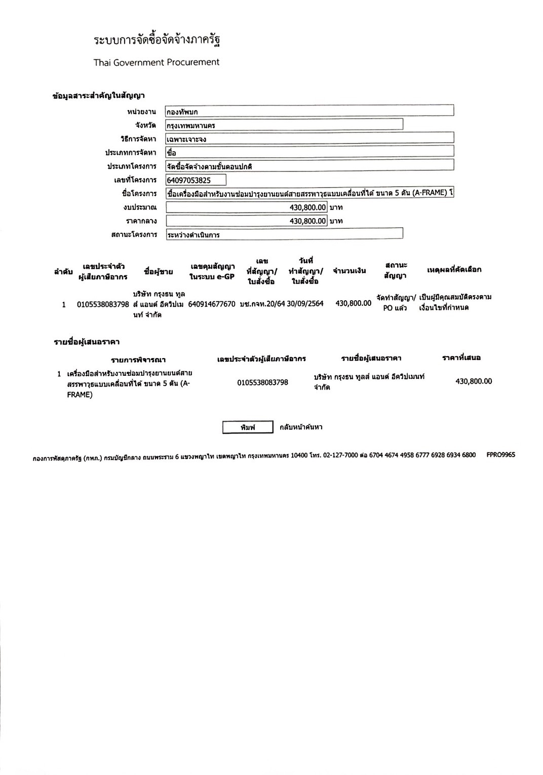 ตามพระราชบัญญัติการจัดซื้อจัดจ้าง และการบริหารพัสดุภาครัฐ พ.ศ. ๒๕๖๐ มาตรา ๙๘ กำหนดให้หน่วยงานของภาครัฐประกาศเผยแพร่สาระสำคัญของสัญญาหรือข้อตกลงที่ได้ลงนามแล้ว รวมทั้งการแก้ไขเปลี่ยนแปลงสัญญาหรือข้อตกลงในระบบเครือข่ายสารสนเทศของกรมบัญชีกลาง และหน่วยงานของรัฐตามที่กรมบัญชีกลางกำหนด