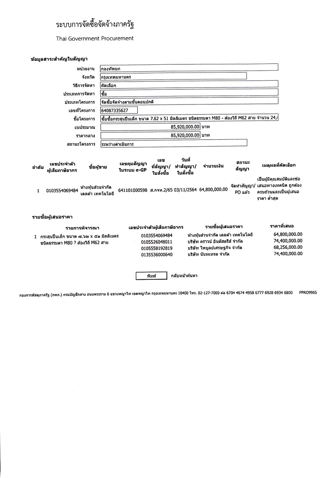 เรื่อง กระสุนปืนเล็ก ขนาด 7.62x51 มิลลิเมตร ชนิดธรรมดา M80-ส่องวิถี-M62 สาย จำนวน 24,000 สาย (2,400,000 นัด)