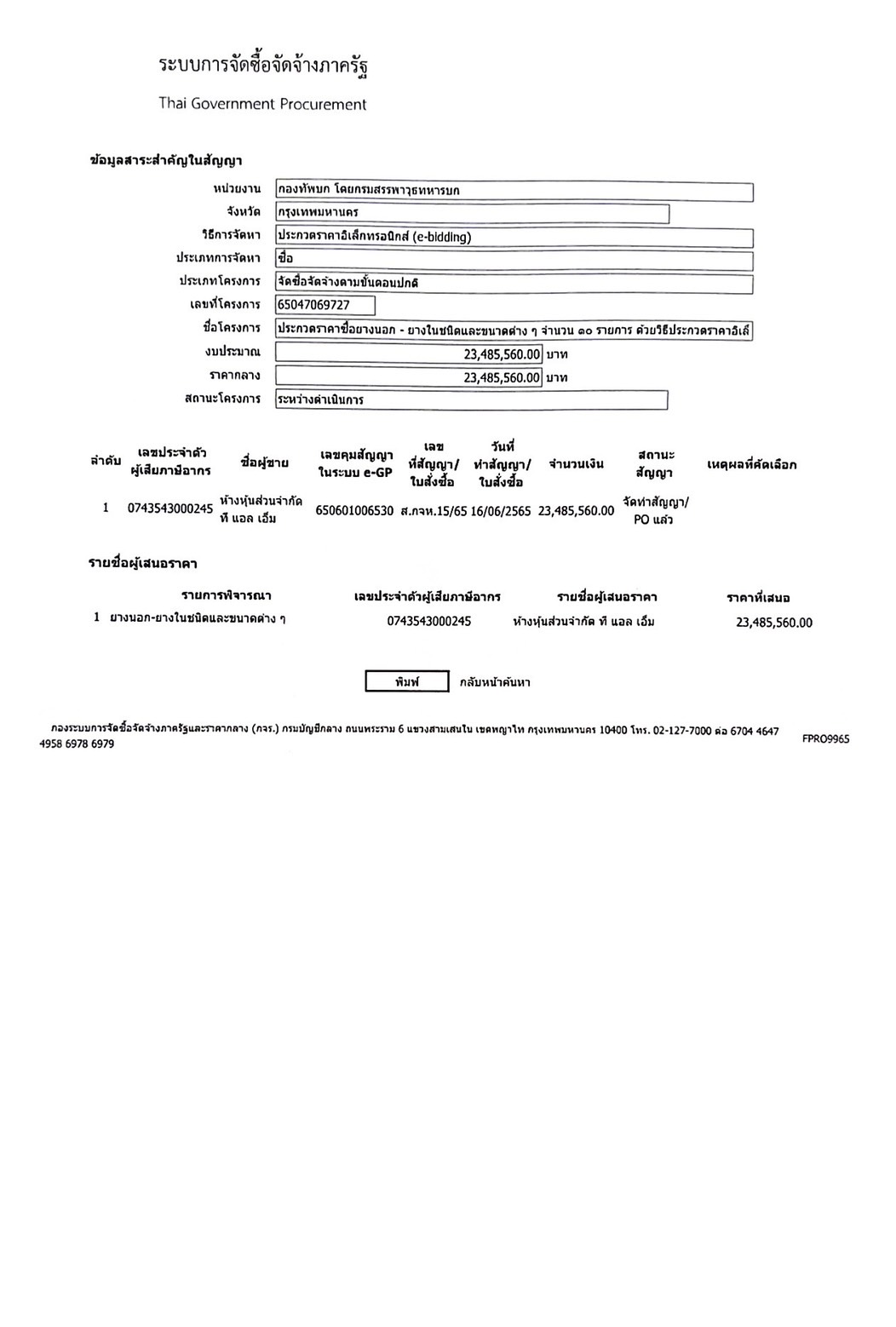 กองทัพบกโดยกรมสรรพาวุธทหารบก ขอประกาศเผยแพร่สาระสำคัญของสัญญาหรือข้อตกลงที่ได้ลงนามแล้วตามเอกสารที่แนบท้ายประกาศนี้