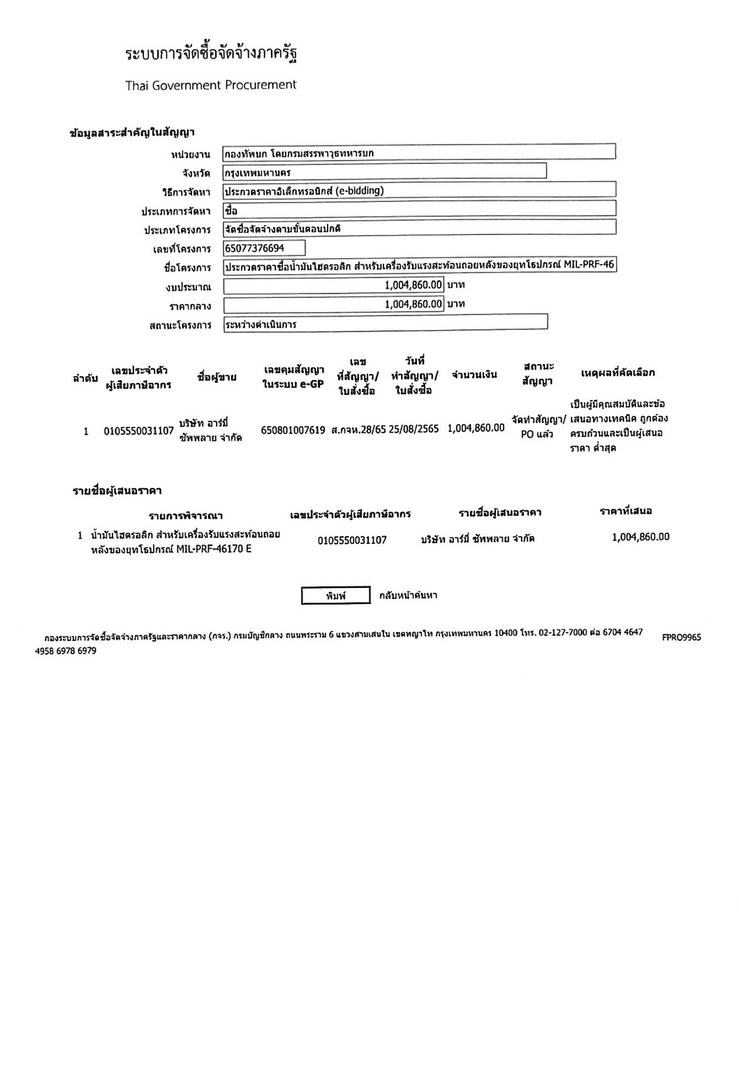 เรื่อง น้ำมันไฮดรอลิก สำหรับเครื่องรับแรงสะท้อนนถอยหลังของยุทโธปกรณ์ MIL-PRF-46170 E
