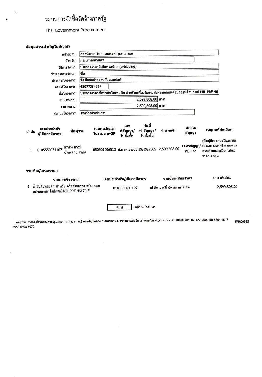เรื่อง น้ำมันไฮดรอลิก สำหรับเครื่องรับแรงสะท้อน ถอยหลังของยุทโธปกรณ์ MIL-PRF-46170 E จำนวน 608 กระป๋อง