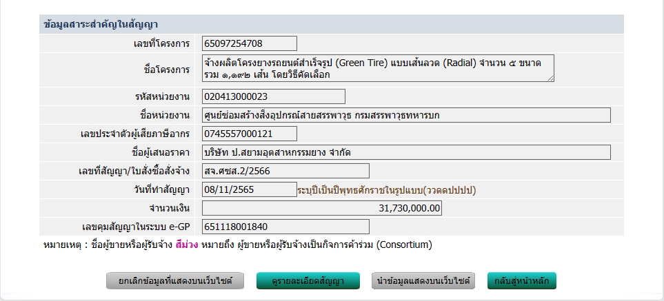ตามพระราชบัญญัติการจัดซื้อจัดจ้าง และการบริหารพัสดุภาครัฐ พ.ศ. ๒๕๖๐ มาตรา ๙๘ กำหนดให้หน่วยงานของภาครัฐประกาศเผยแพร่สาระสำคัญของสัญญาหรือข้อตกลงที่ได้ลงนามแล้ว รวมทั้งการแก้ไขเปลี่ยนแปลงสัญญาหรือข้อตกลงในระบบเครือข่ายสารสนเทศของกรมบัญชีกลาง และหน่วยงานของรัฐตามที่กรมบัญชีกลางกำหนด