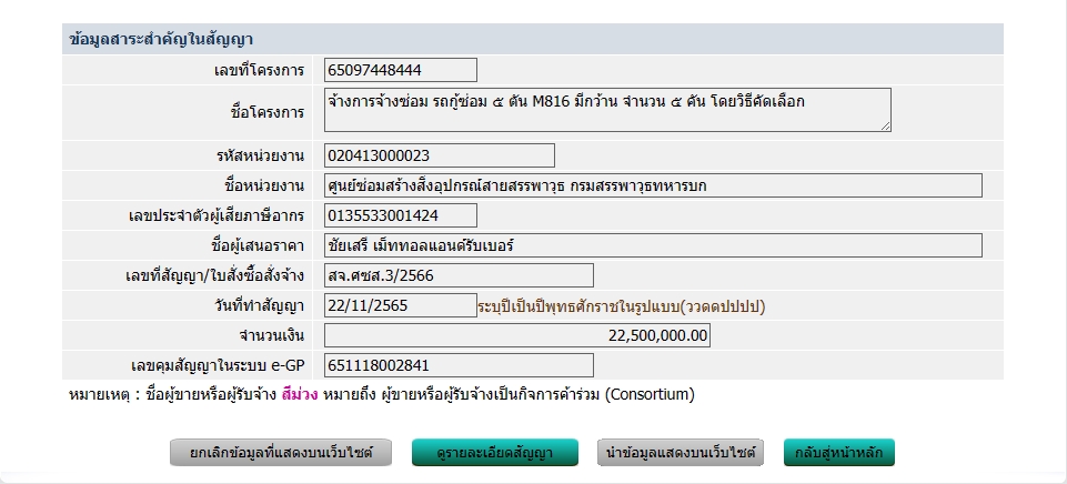 กองทัพบกโดยกรมสรรพาวุธทหารบก ขอประกาศเผยแพร่สาระสำคัญของสัญญาหรือข้อตกลงที่ได้ลงนามแล้วตามเอกสารที่แนบท้ายประกาศนี้