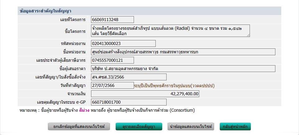 กองทัพบกโดยกรมสรรพาวุธทหารบก ขอประกาศเผยแพร่สาระสำคัญของสัญญาหรือข้อตกลงที่ได้ลงนามแล้วตามเอกสารที่แนบท้ายประกาศนี้