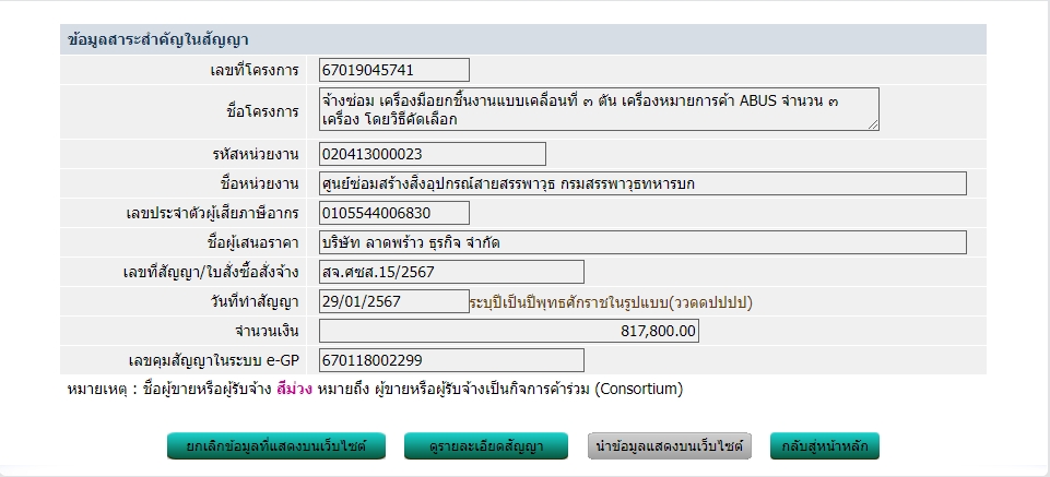 ตามพระราชบัญญัติการจัดซื้อจัดจ้าง และการบริหารพัสดุภาครัฐ พ.ศ. ๒๕๖๐ มาตรา ๙๘ กำหนดให้หน่วยงานของภาครัฐประกาศเผยแพร่สาระสำคัญของสัญญาหรือข้อตกลงที่ได้ลงนามแล้ว รวมทั้งการแก้ไขเปลี่ยนแปลงสัญญาหรือข้อตกลงในระบบเครือข่ายสารสนเทศของกรมบัญชีกลาง และหน่วยงานของรัฐตามที่กรมบัญชีกลางกำหนด