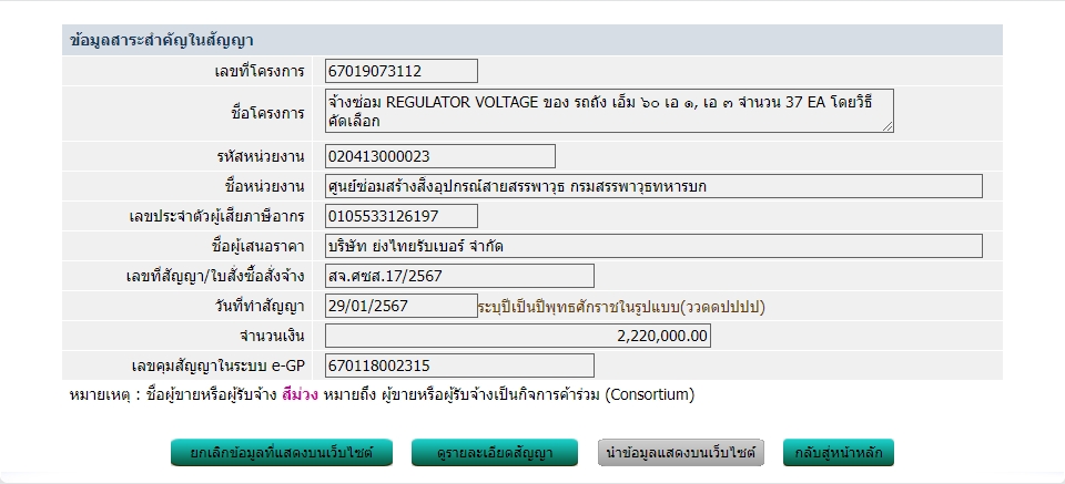 ตามพระราชบัญญัติการจัดซื้อจัดจ้าง และการบริหารพัสดุภาครัฐ พ.ศ. ๒๕๖๐ มาตรา ๙๘ กำหนดให้หน่วยงานของภาครัฐประกาศเผยแพร่สาระสำคัญของสัญญาหรือข้อตกลงที่ได้ลงนามแล้ว รวมทั้งการแก้ไขเปลี่ยนแปลงสัญญาหรือข้อตกลงในระบบเครือข่ายสารสนเทศของกรมบัญชีกลาง และหน่วยงานของรัฐตามที่กรมบัญชีกลางกำหนด