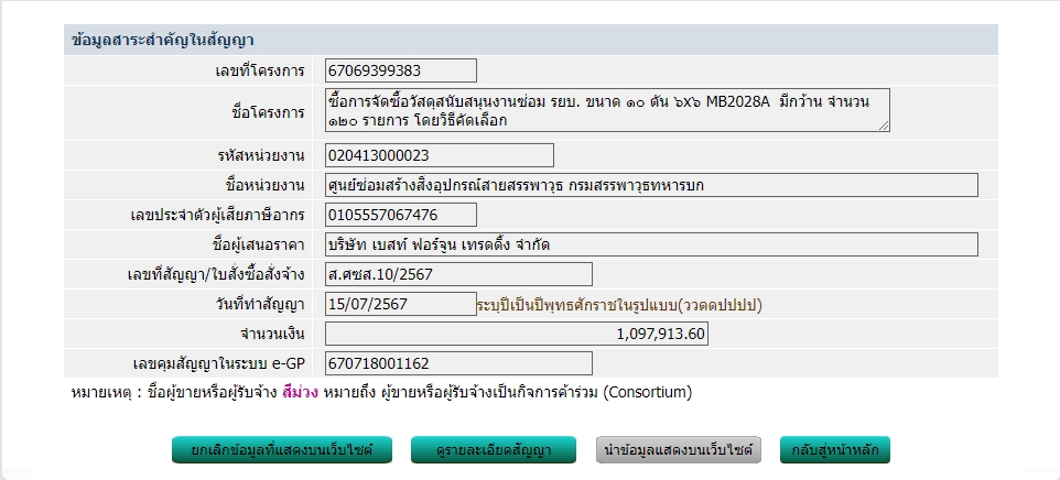 ตามพระราชบัญญัติการจัดซื้อจัดจ้าง และการบริหารพัสดุภาครัฐ พ.ศ. ๒๕๖๐ มาตรา ๙๘ กำหนดให้หน่วยงานของภาครัฐประกาศเผยแพร่สาระสำคัญของสัญญาหรือข้อตกลงที่ได้ลงนามแล้ว รวมทั้งการแก้ไขเปลี่ยนแปลงสัญญาหรือข้อตกลงในระบบเครือข่ายสารสนเทศของกรมบัญชีกลาง และหน่วยงานของรัฐตามที่กรมบัญชีกลางกำหนด