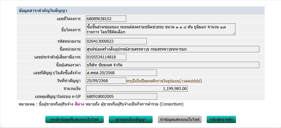 กองทัพบกโดยกรมสรรพาวุธทหารบก ขอประกาศเผยแพร่สาระสำคัญของสัญญาหรือข้อตกลงที่ได้ลงนามแล้วตามเอกสารที่แนบท้ายประกาศนี้