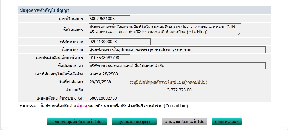 กองทัพบกโดยกรมสรรพาวุธทหารบก ขอประกาศเผยแพร่สาระสำคัญของสัญญาหรือข้อตกลงที่ได้ลงนามแล้วตามเอกสารที่แนบท้ายประกาศนี้