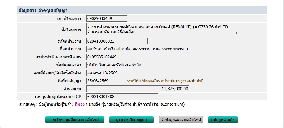 กองทัพบกโดยกรมสรรพาวุธทหารบก ขอประกาศเผยแพร่สาระสำคัญของสัญญาหรือข้อตกลงที่ได้ลงนามแล้วตามเอกสารที่แนบท้ายประกาศนี้