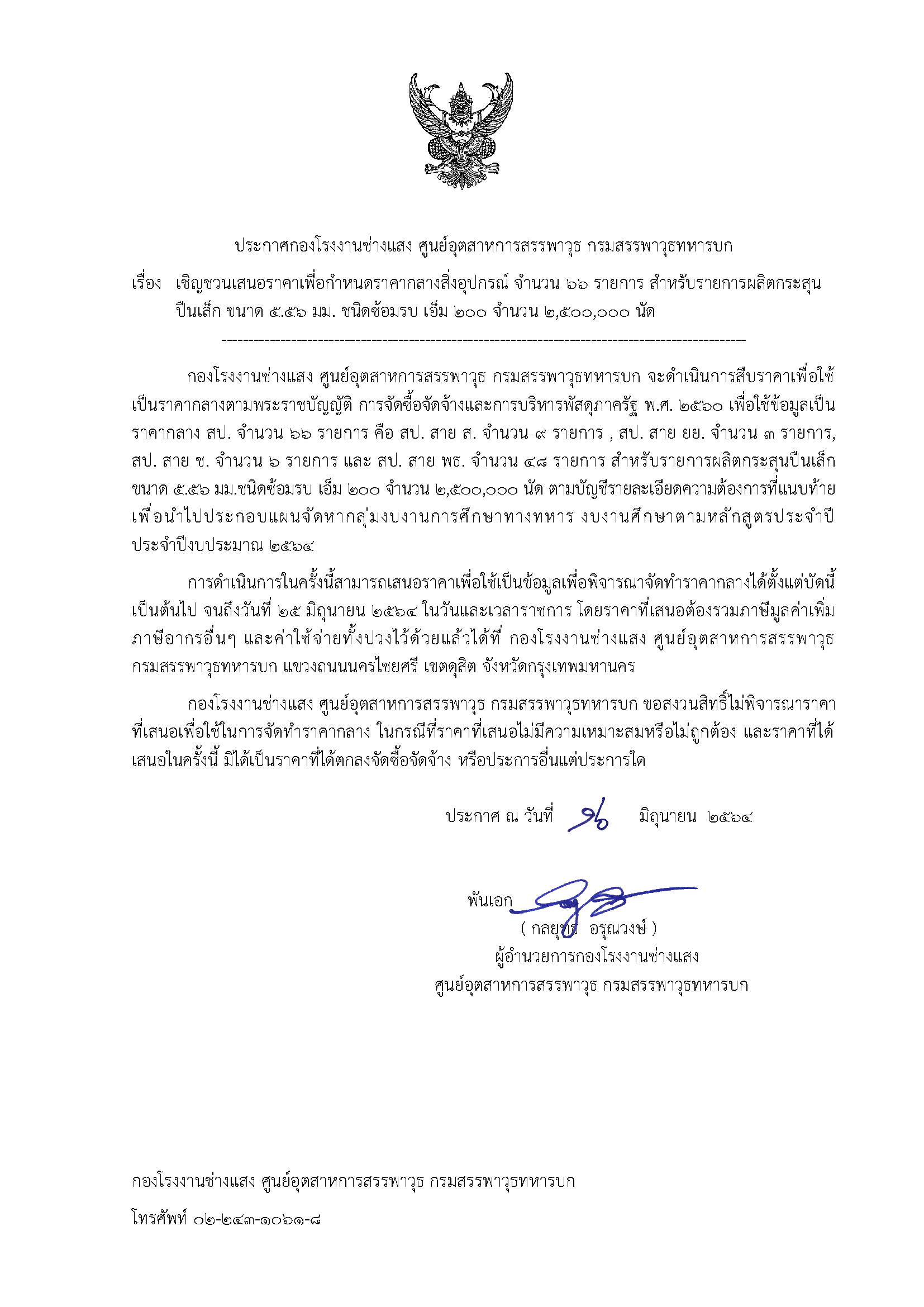 เรื่อง เชิญชวนเสนอราคาเพื่อกำหนดราคากลางสิ่งอุปกรณ์ จำนวน 70 รายการ สำหรับรายการผลิตกระสุน ปืนเล็ก ขนาด 5.56 มม. ชนิดซ้อมรบ เอ็ม 200 จำนวน 2,500,000 นัด