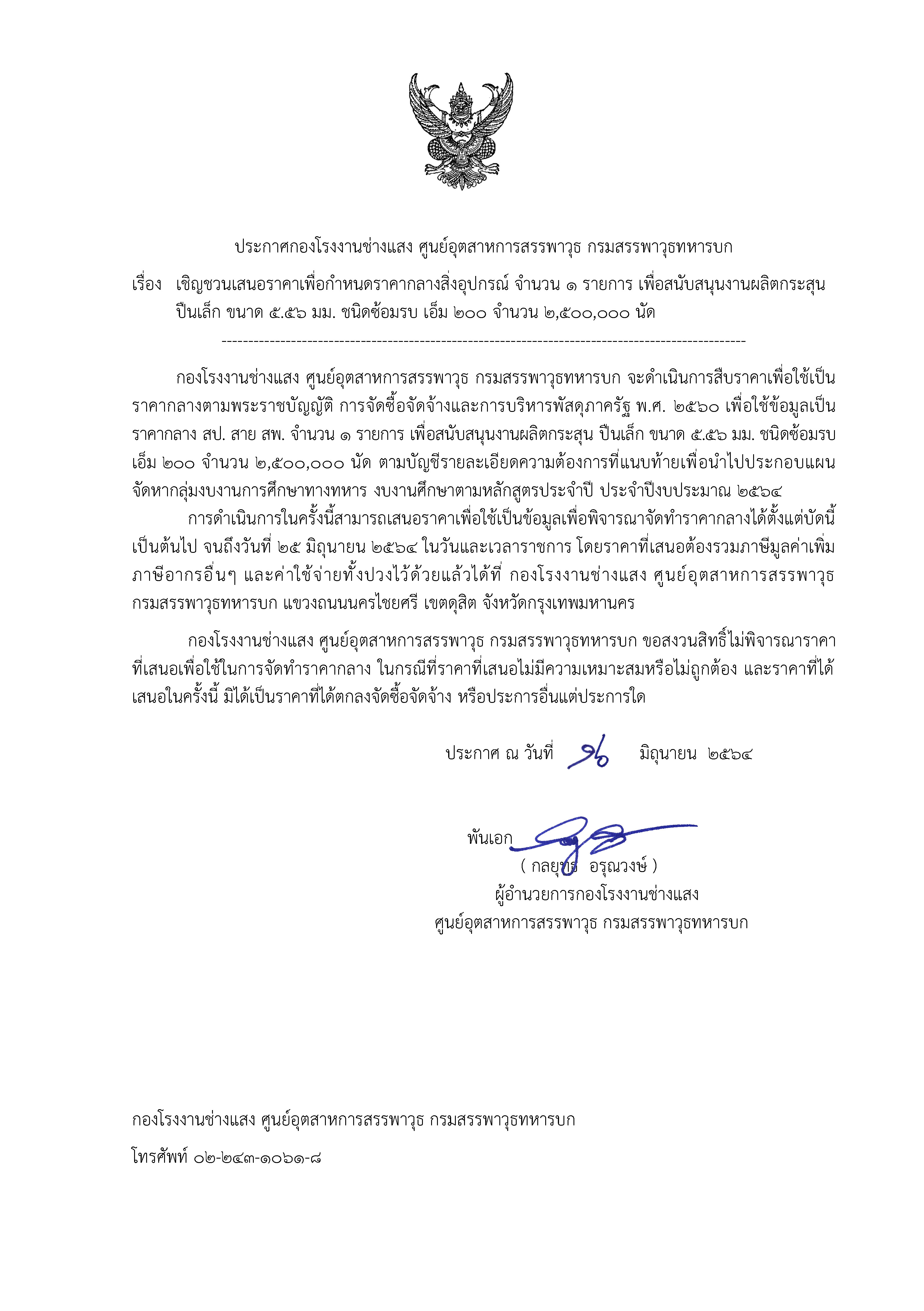 เรื่อง เชิญชวนเสนอราคาเพื่อกำหนดราคากลางสิ่งอุปกรณ์ จำนวน 1 รายการ เพื่อสนับสนุนงานผลิตกระสุนปืนเล็ก ขนาด 5.56 มม. ชนิดซ้อมรบ เอ็ม 200 จำนวน 2,500,000 นัด