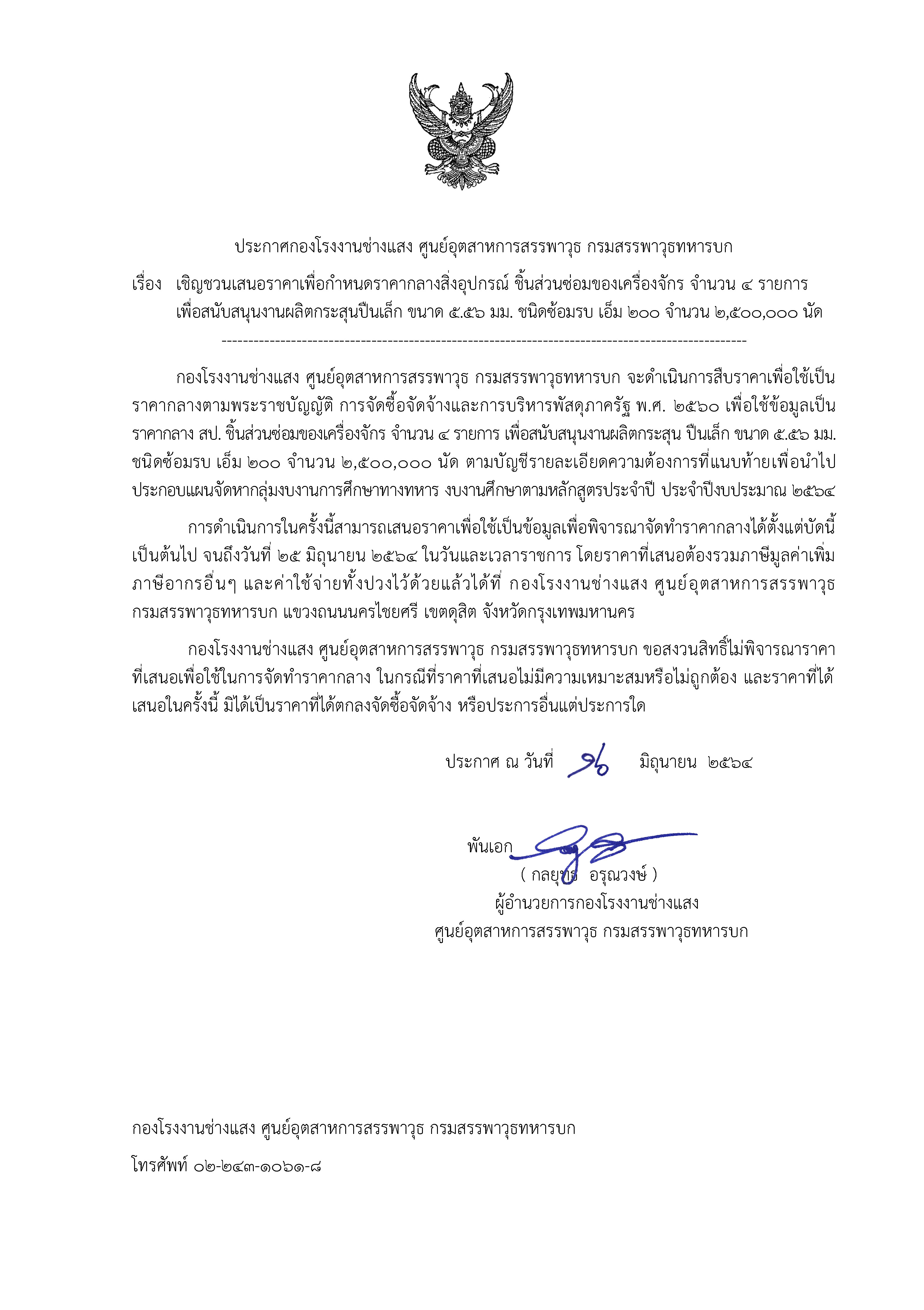 เรื่อง เชิญชวนเสนอราคาเพื่อกำหนดราคากลางสิ่งอุปกรณ์ ชิ้นส่วนซ่อมของเครื่องจักร จำนวน 4 รายการ เพื่อสนับสนุนงานผลิตกระสุนปืนเล็ก ขนาด 5.56 มม. ชนิดซ้อมรบ เอ็ม 200 จำนวน 2,500,000 นัด