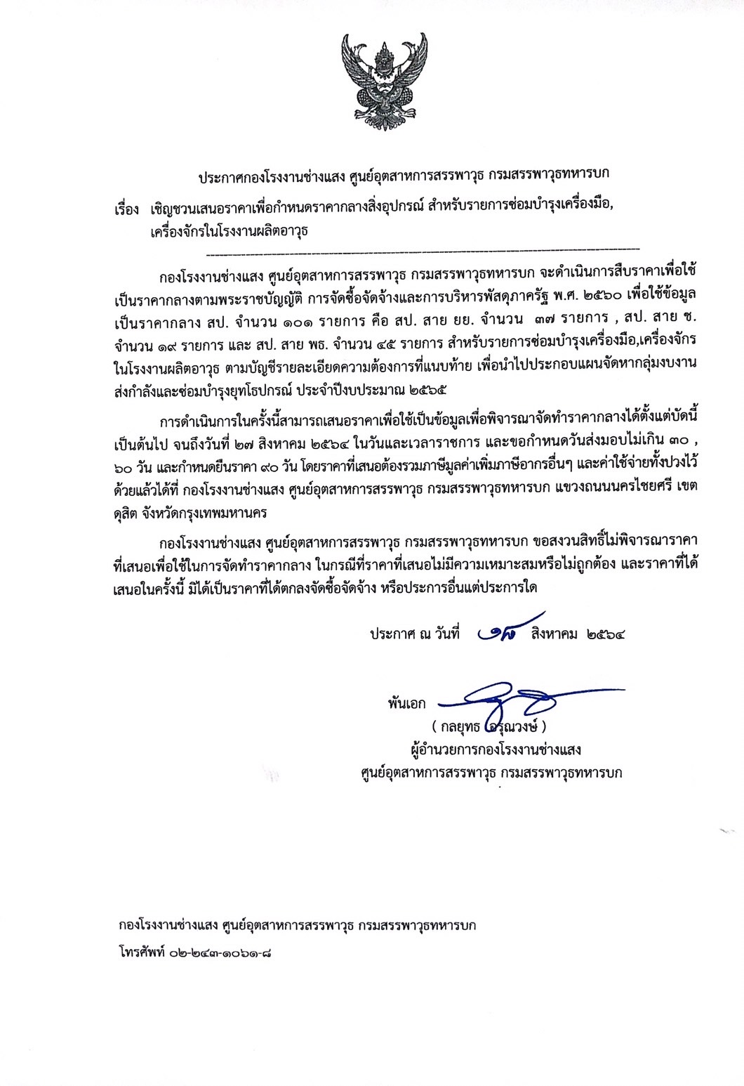 เรื่อง เชิญชวนเสนอราคาเพื่อกำหนดราคากลางสิ่งอุปกรณ์ สำหรับรายการซ่อมบำรุงเครื่องมือ, เครื่องจักรในโรงงานผลิตอาวุธ