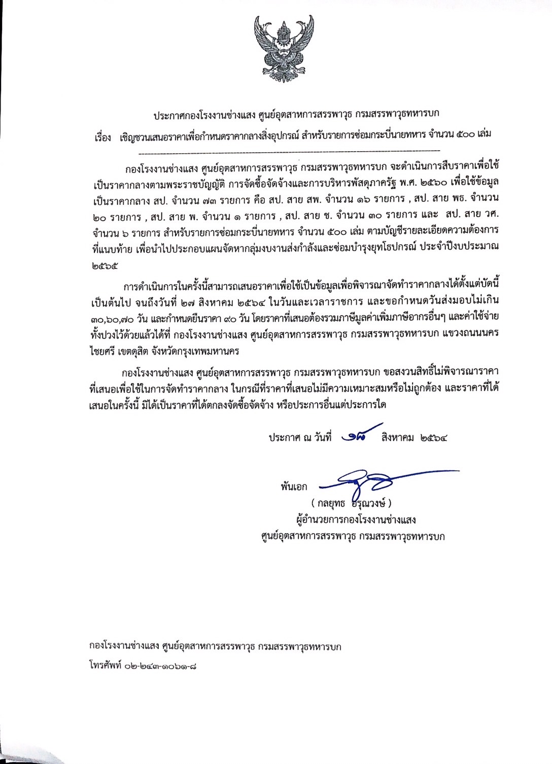 เรื่อง เชิญชวนเสนอราคาเพื่อกำหนดราคากลางสิ่งอุปกรณ์ สำหรับรายการซ่อมกระบี่นายทหาร จำนวน ๕๐๐ เล่ม