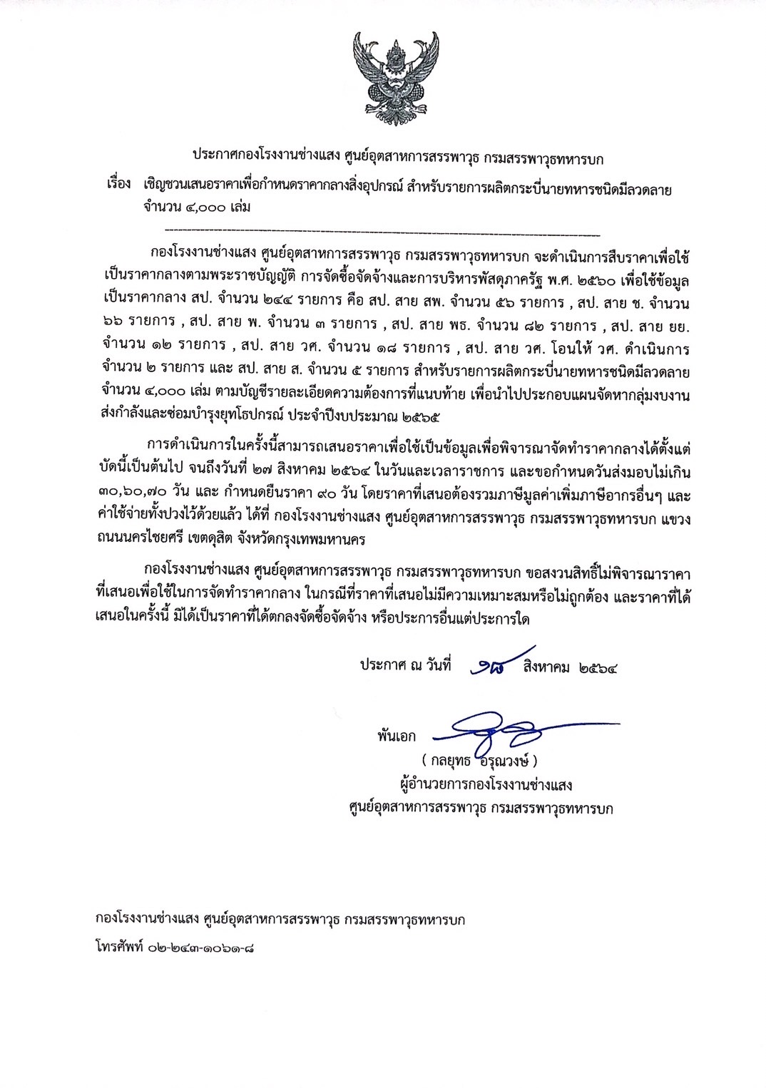 เรื่อง เชิญชวนเสนอราคาเพื่อกำหนดราคากลางสิ่งอุปกรณ์ สำหรับรายการผลิตกระบี่นายทหารชนิดมีลวดลาย จำนวน ๔,๐๐๐ เล่ม
