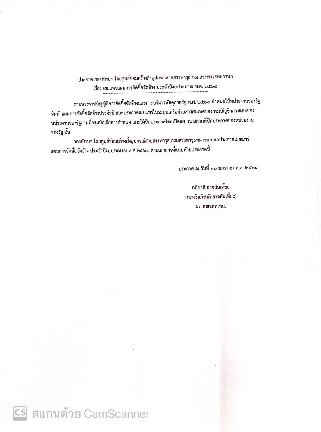 กองทัพบก โดยศูนย์ซ่อมสร้างสิ่งอุปกรณ์สายสรรพาวุธ กรมสรรพาวุธทหารบก ขอประกาศเผยแพร่แผนการจัดซื้อจัดจ้าง ประจำปีงบประมาณ ๒๕๖๔ ตามเอกสารที่แนบท้ายประกาศนี้