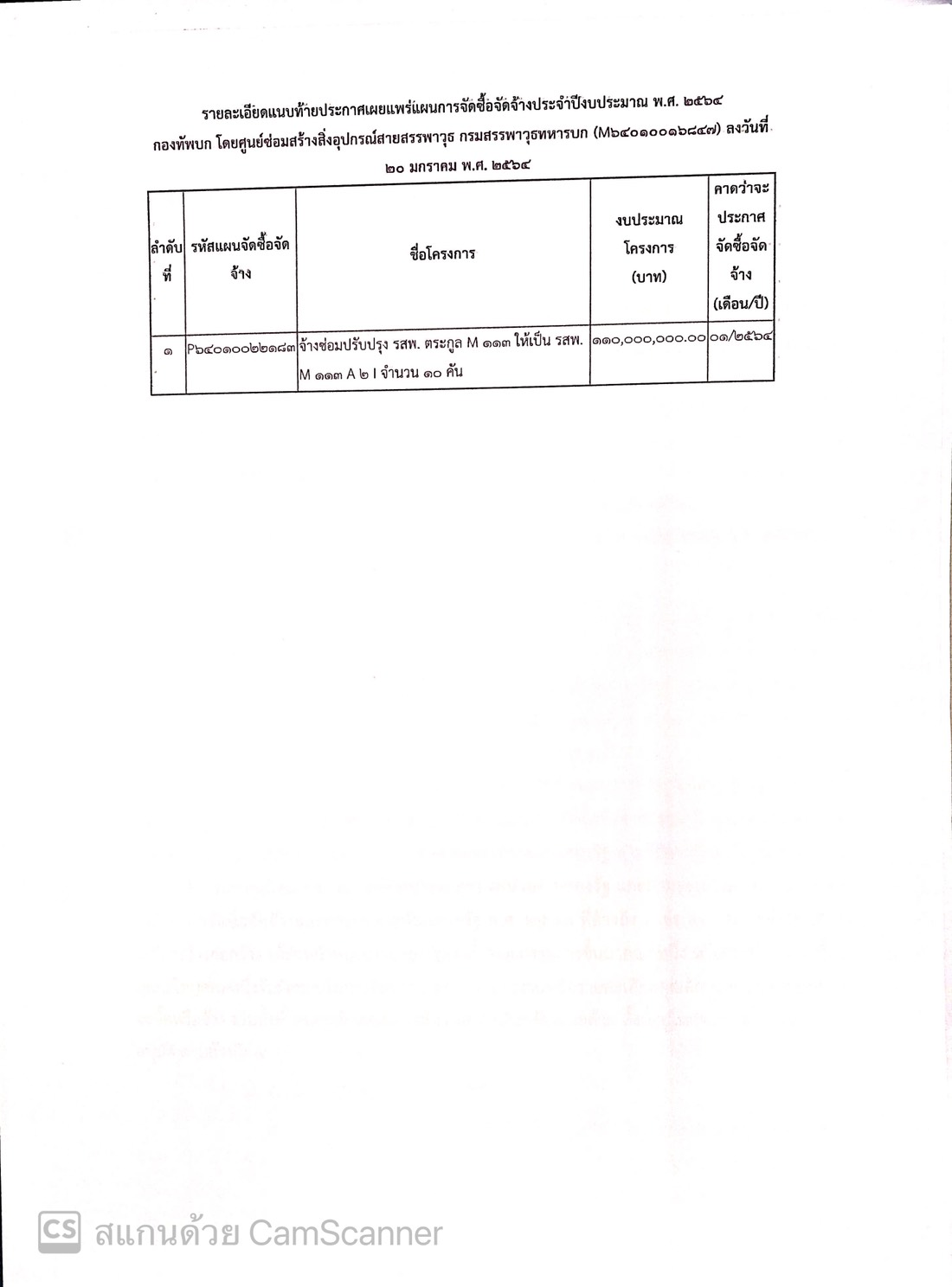 เรื่อง เผยแพร่แผนการจัดซื้อจัดจ้าง ประจำปีงบประมาณ พ.ศ. ๒๕๖๔ เรื่อง จ้างซ่อมปรับปรุง รสพ. ตระกูล M 113 ให้เป็น รสพ. M 113 A 2 I จำนวน 10 คัน