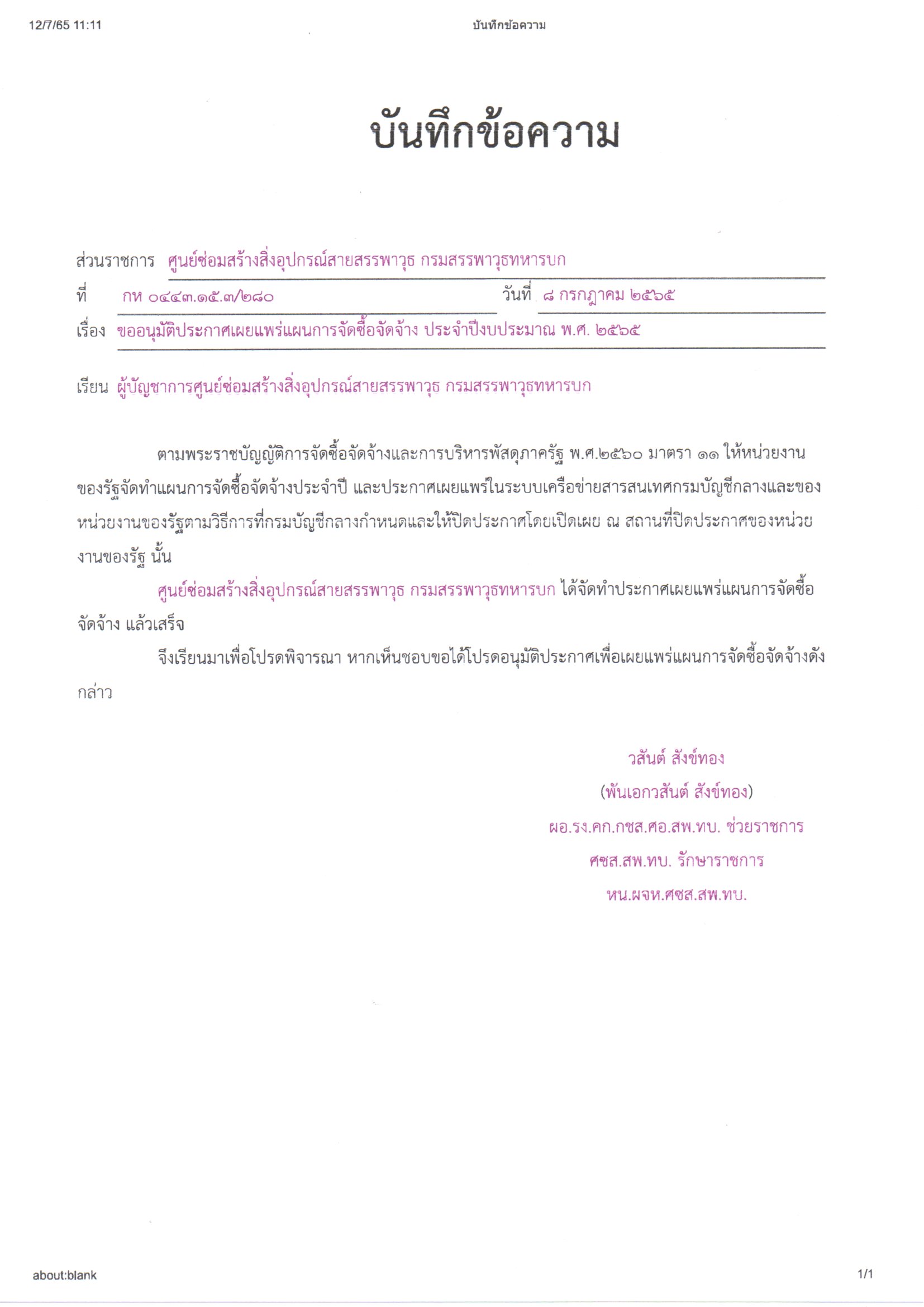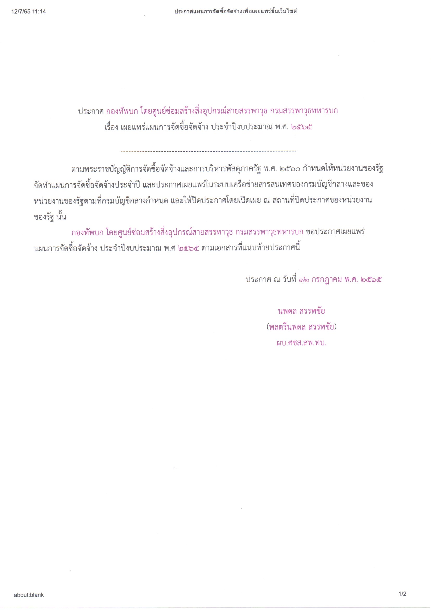 กองทัพบก โดยศูนย์ซ่อมสร้างสิ่งอุปกรณ์สายสรรพาวุธ กรมสรรพาวุธทหารบก ขอประกาศเผยแพร่แผนการจัดซื้อจัดจ้าง ประจำปีงบประมาณ ๒๕๖๕ ตามเอกสารที่แนบท้ายประกาศนี้
