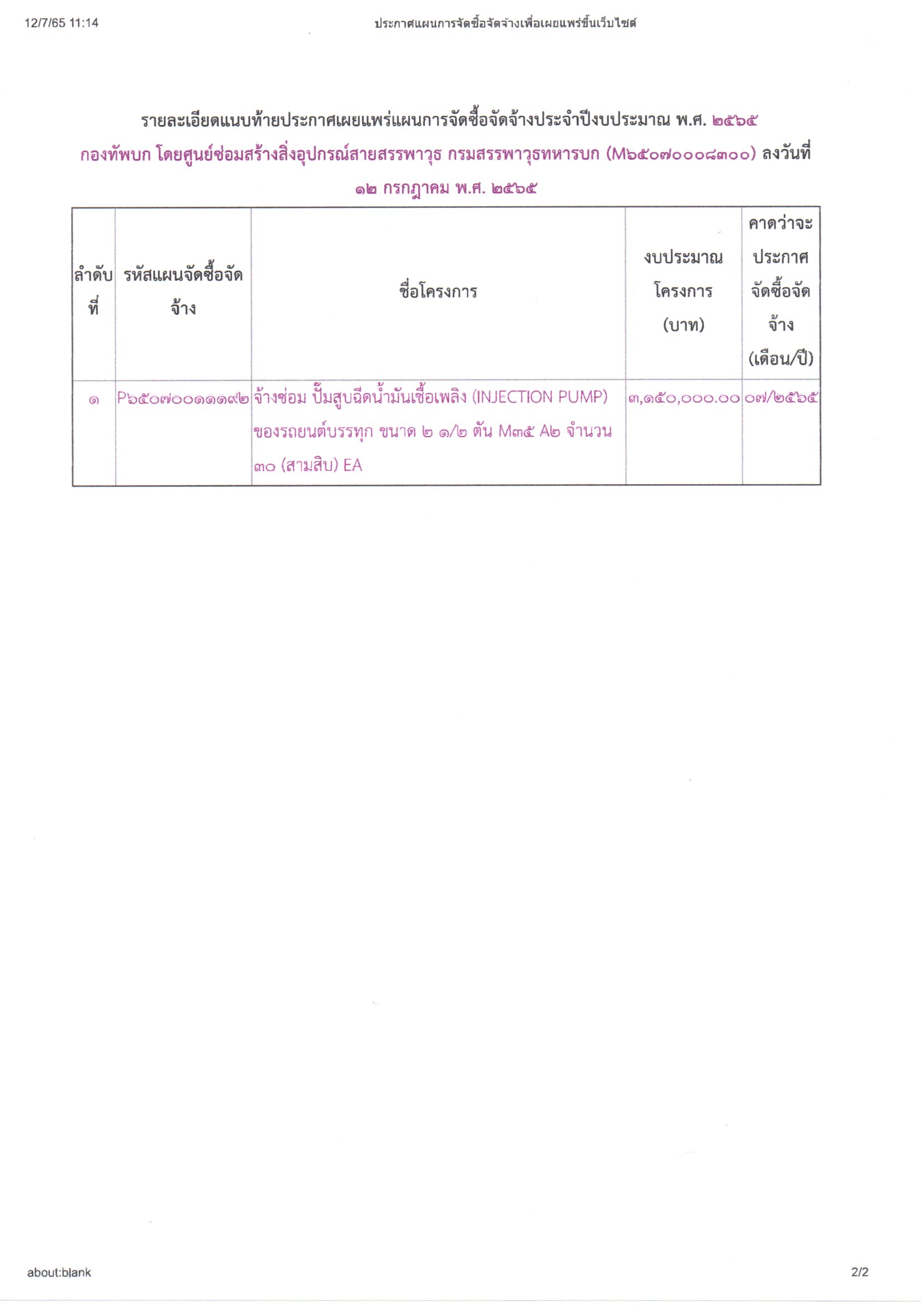 เรื่อง เผยแพร่แผนการจัดซื้อจัดจ้าง ประจำปีงบประมาณ ๒๕๖๕ จ้างซ่อม ปั๊มสูบฉีดน้ำมันเชื้อเพลิง (INJECTION PUMP) ของรถยนต์บรรทุก ขนาด ๒ ๑/๒ ตัน M35 A2 จำนวน ๓๐ (สามสิบ) EA
