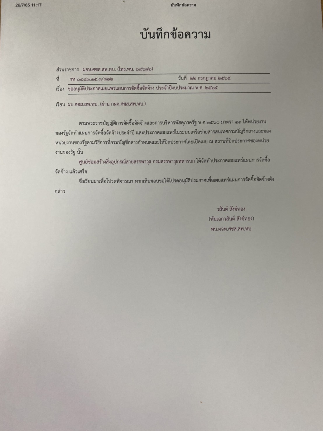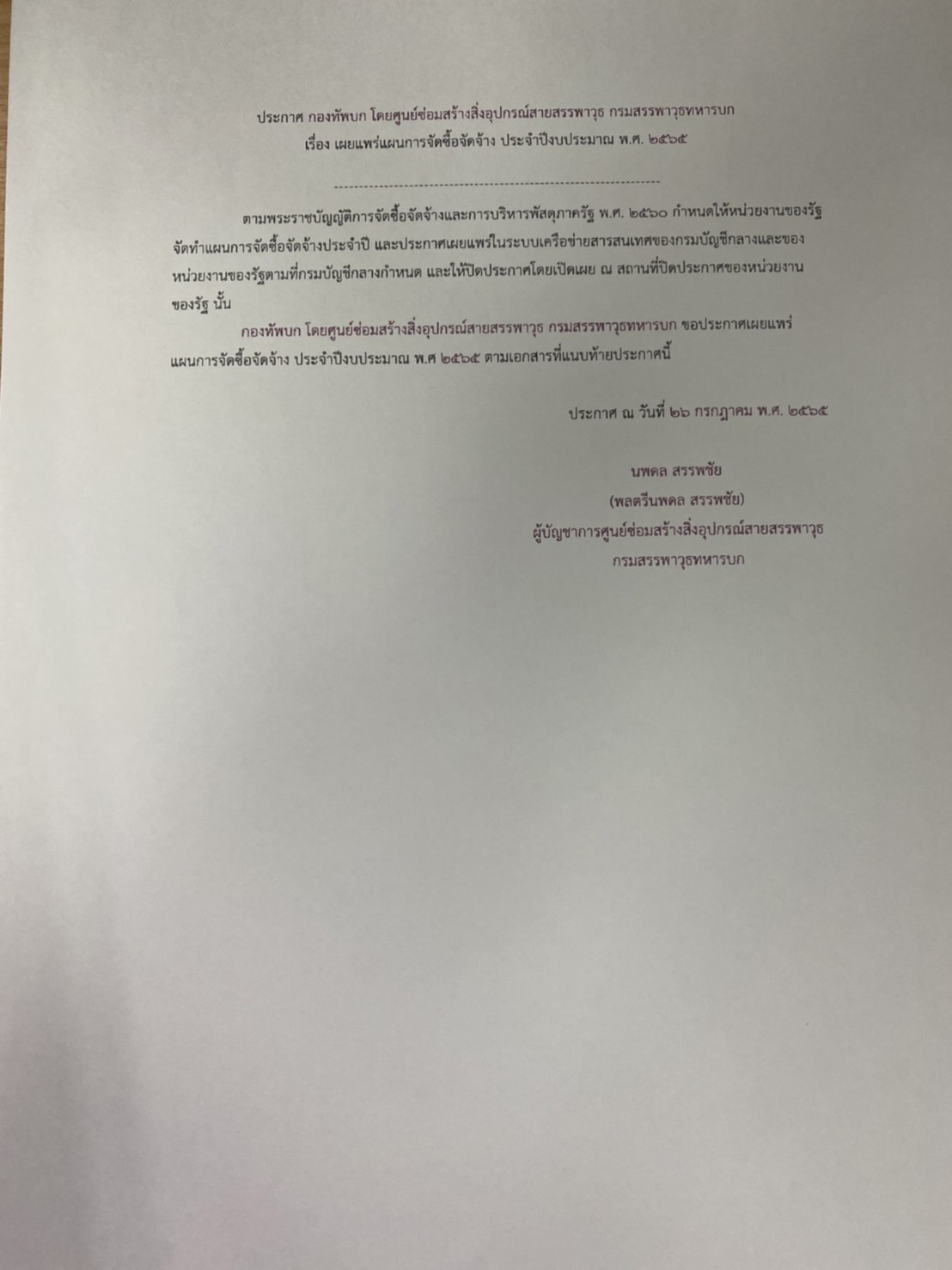 กองทัพบก โดยศูนย์ซ่อมสร้างสิ่งอุปกรณ์สายสรรพาวุธ กรมสรรพาวุธทหารบก ขอประกาศเผยแพร่แผนการจัดซื้อจัดจ้าง ประจำปีงบประมาณ พ.ศ ๒๕๖๕ ตามเอกสารที่แนบท้ายประกาศนี้