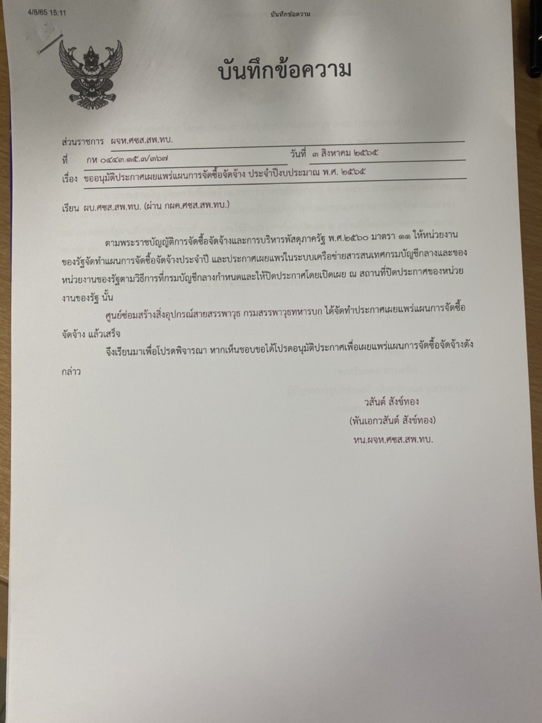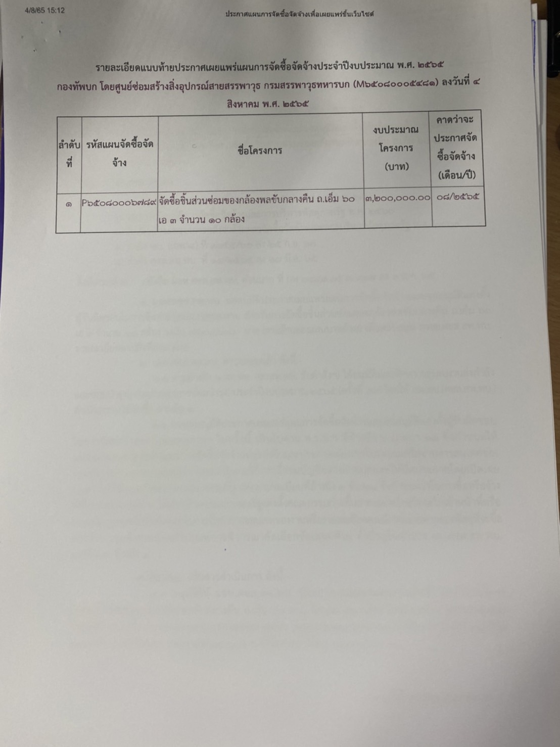 เรื่อง เผยแพร่แผนการจัดซื้อจัดจ้าง ประจำปีงบประมาณ ๒๕๖๕ เรื่อง จัดซื้อชิ้นส่วนซ่อมของกล้องพลขับกลางคืน ถ.เอ็ม ๖๐ เอ ๓ จำนวน ๑๐ กล้อง