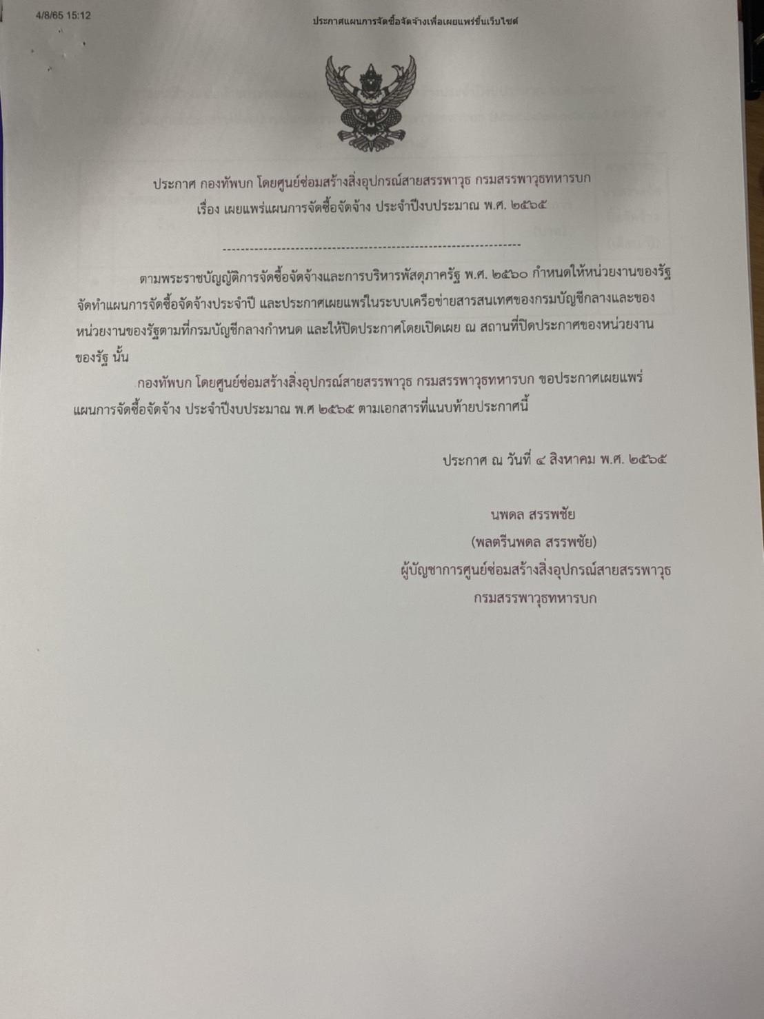 กองทัพบก โดยศูนย์ซ่อมสร้างสิ่งอุปกรณ์สายสรรพาวุธ กรมสรรพาวุธทหารบก ขอประกาศเผยแพร่แผนการจัดซื้อจัดจ้าง ประจำปีงบประมาณ ๒๕๖๕ ตามเอกสารที่แนบท้ายประกาศนี้