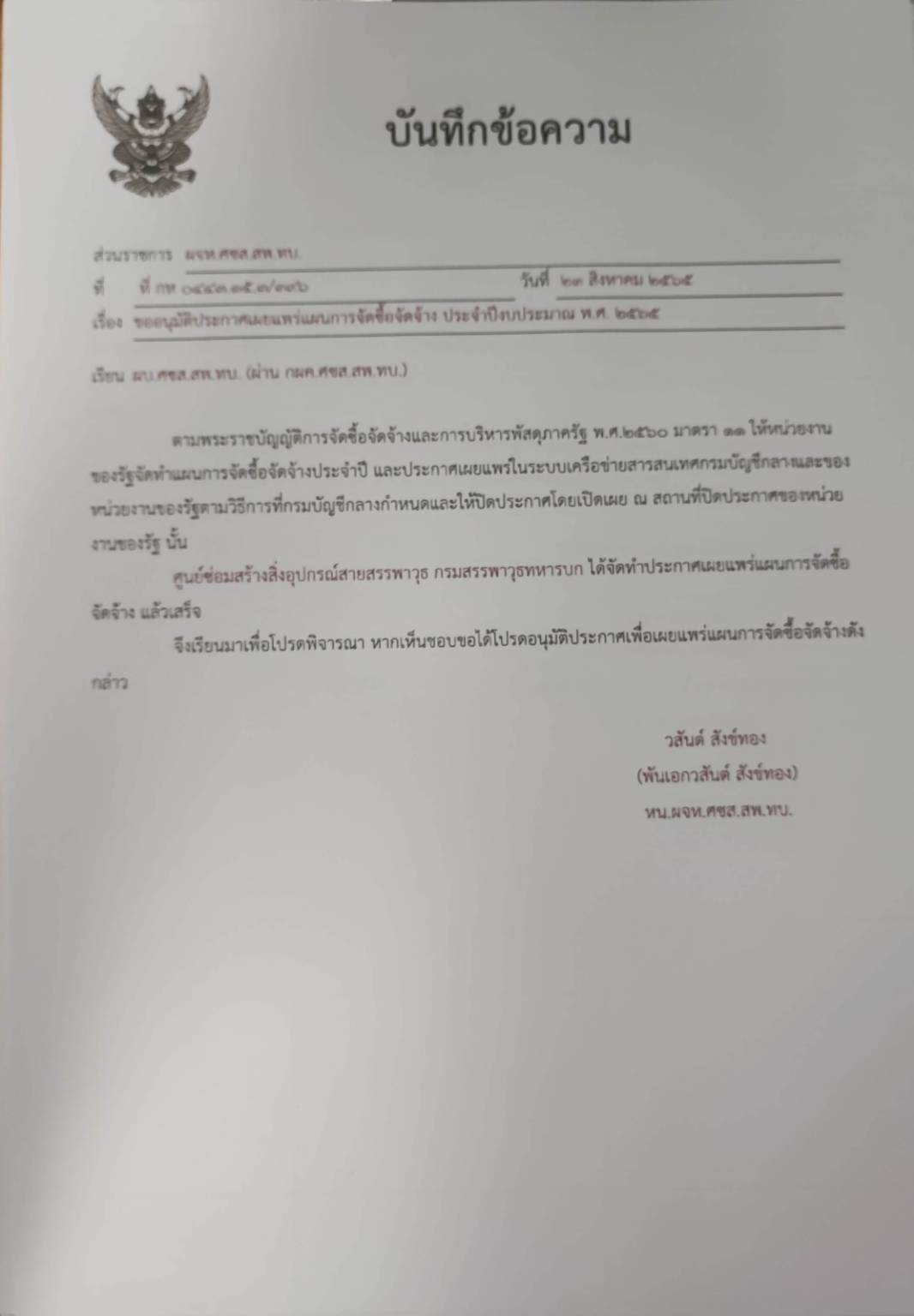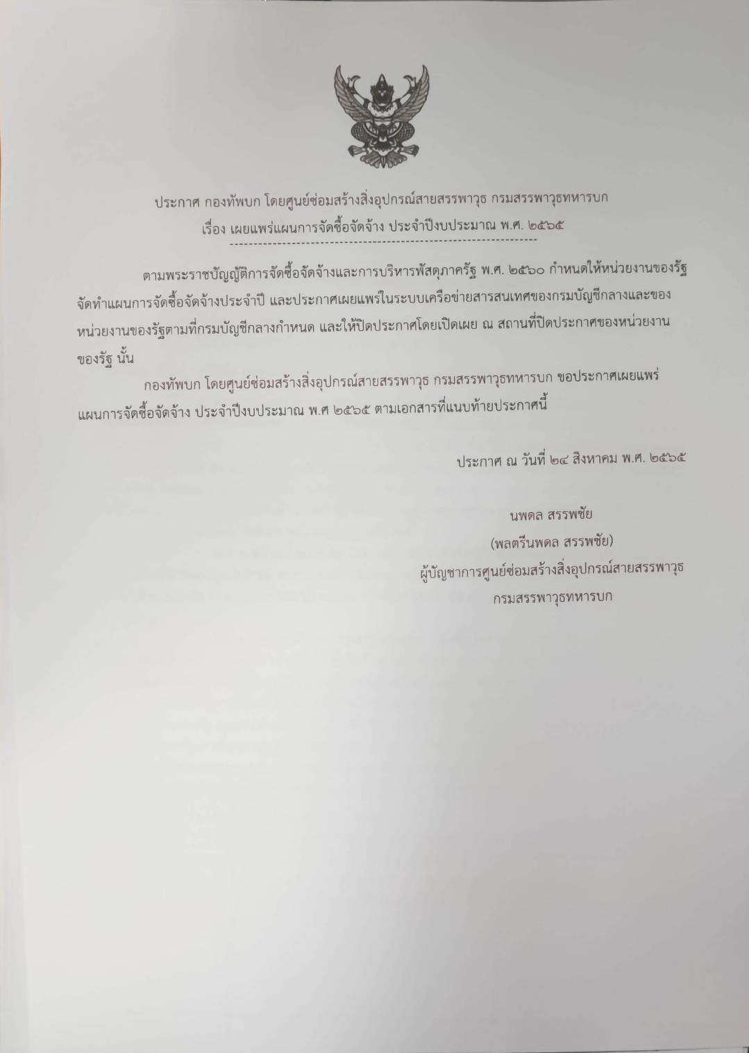 กองทัพบก โดยศูนย์ซ่อมสร้างสิ่งอุปกรณ์สายสรรพาวุธ กรมสรรพาวุธทหารบก ขอประกาศเผยแพร่แผนการจัดซื้อจัดจ้าง ประจำปีงบประมาณ ๒๕๖๕ ตามเอกสารที่แนบท้ายประกาศนี้