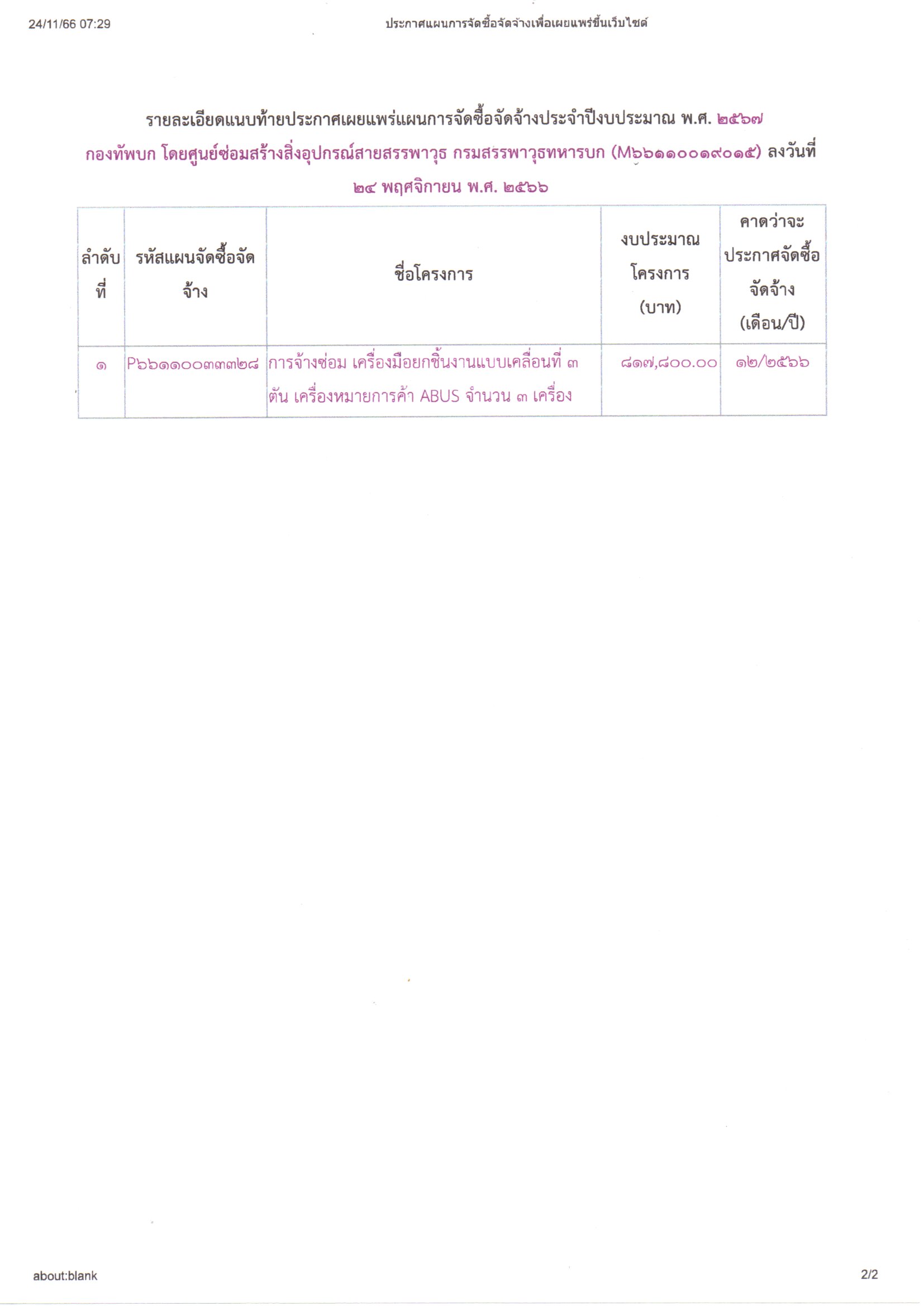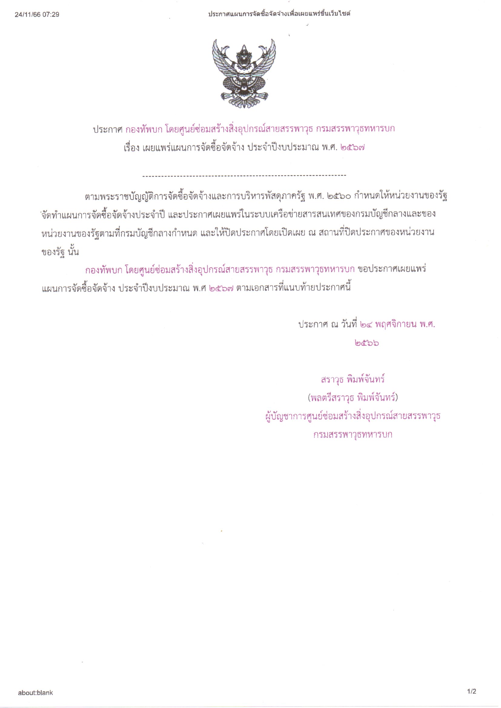 กองทัพบก โดยศูนย์ซ่อมสร้างสิ่งอุปกรณ์สายสรรพาวุธ กรมสรรพาวุธทหารบก ขอประกาศเผยแพร่แผนการจัดซื้อจัดจ้าง ประจำปีงบประมาณ พ.ศ ๒๕๖๗ ตามเอกสารที่แนบท้ายประกาศนี้