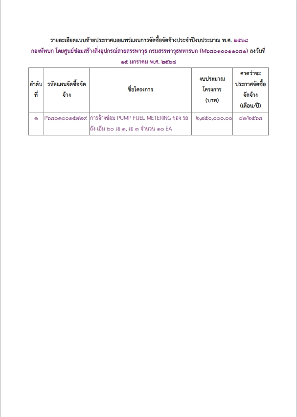 เรื่อง เผยแพร่แผนการจัดซื้อจัดจ้าง ประจำปีงบประมาณ พ.ศ ๒๕๖๘ เรื่อง การจ้างซ่อม PUMP FUEL METERING ของ รถถัง เอ็ม ๖๐ เอ ๑, เอ ๓ จำนวน 10 EA