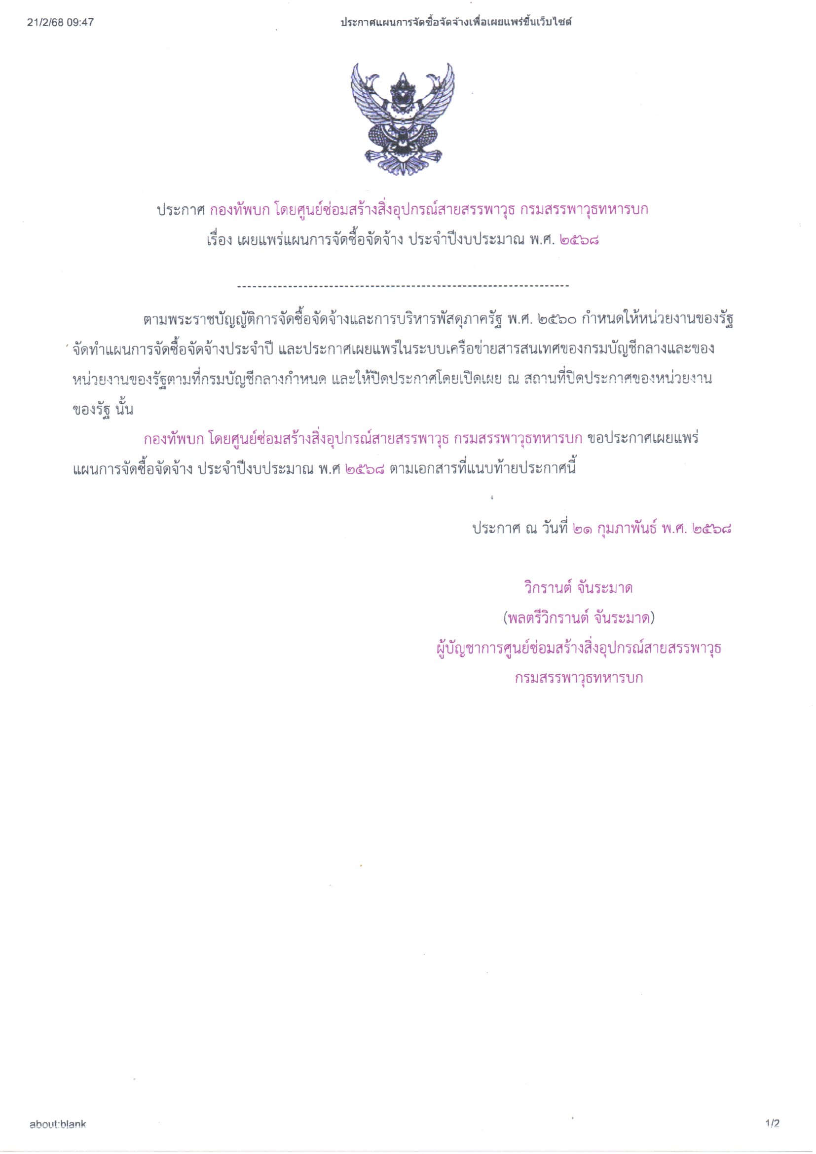 กองทัพบก โดยศูนย์ซ่อมสร้างสิ่งอุปกรณ์สายสรรพาวุธ กรมสรรพาวุธทหารบก ขอประกาศเผยแพร่แผนการจัดซื้อจัดจ้าง ประจำปีงบประมาณ พ.ศ. ๒๕๖๘ ตามเอกสารที่แนบท้ายประกาศนี้