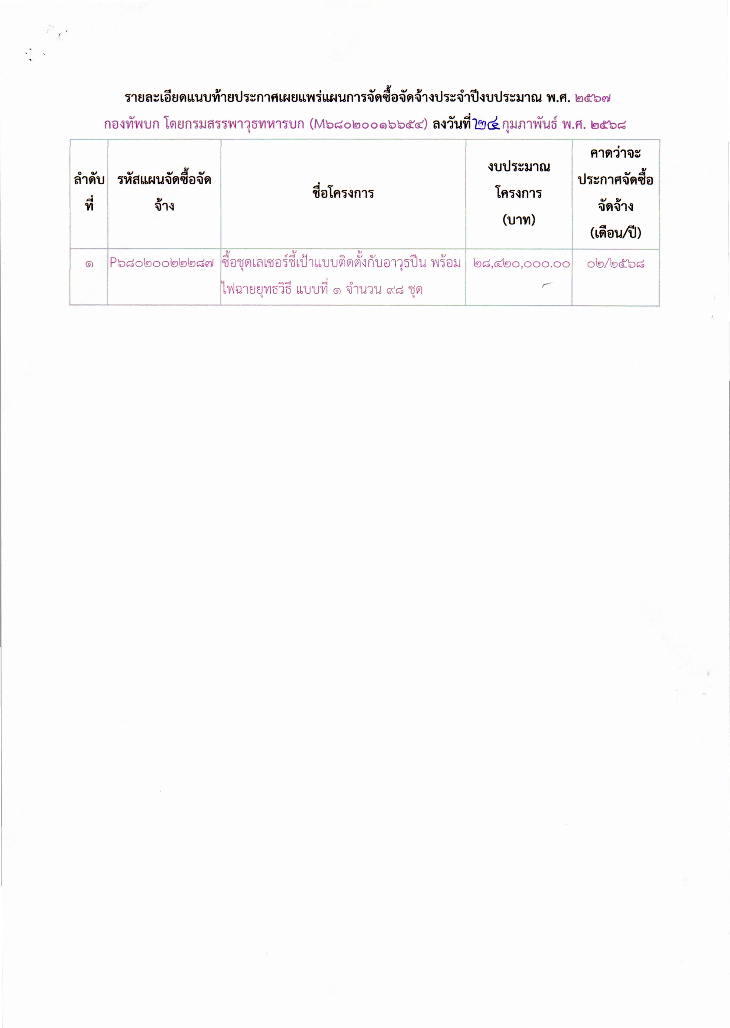 กองทัพบก โดยกรมสรรพาวุธทหารบก ขอประกาศเผยแพร่แผนการจัดซื้อจัดจ้าง ประจำ ปีงบประมาณ