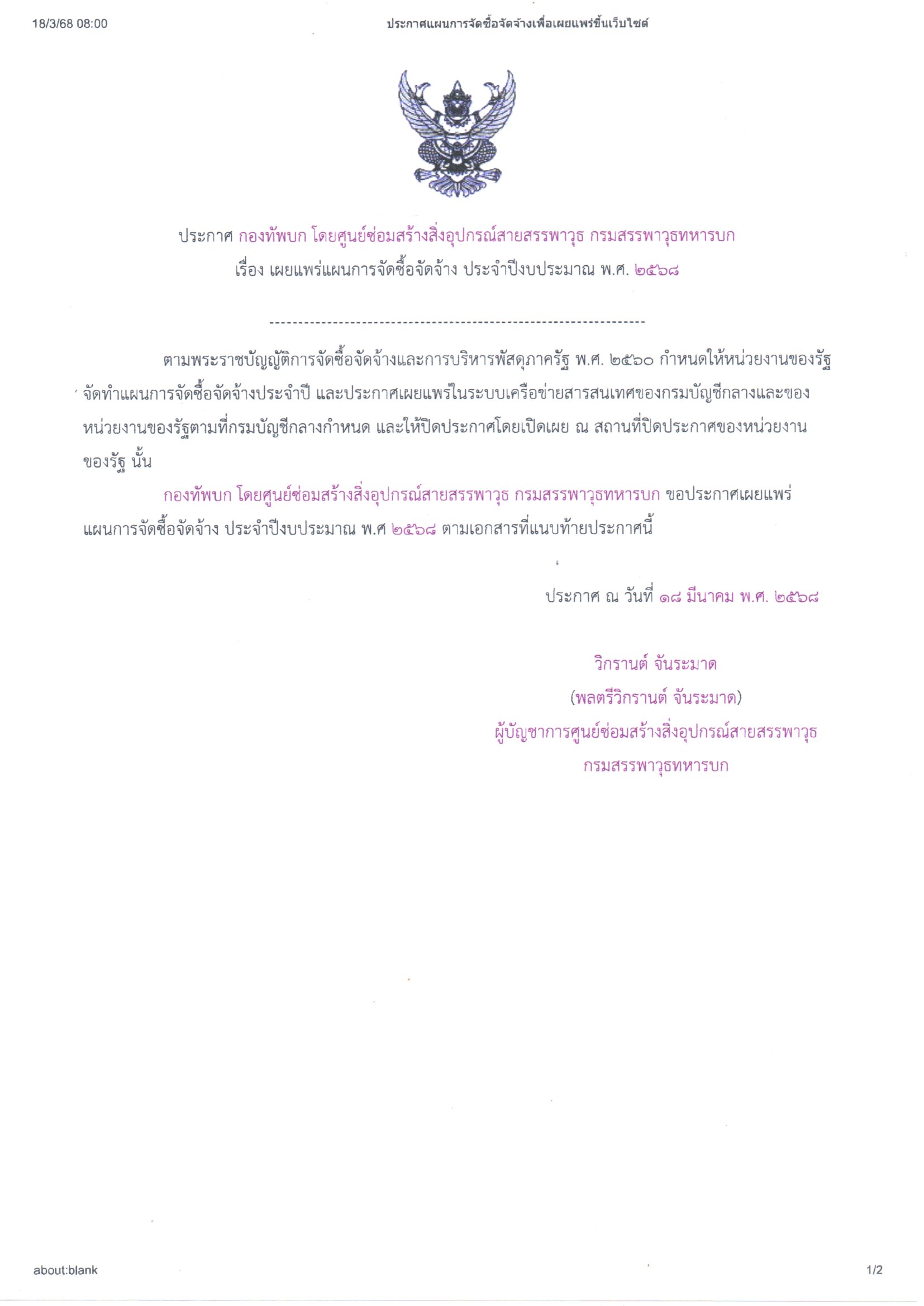 กองทัพบก โดยศูนย์ซ่อมสร้างสิ่งอุปกรณ์สายสรรพาวุธ กรมสรรพาวุธทหารบก ขอประกาศเผยแพร่แผนการจัดซื้อจัดจ้าง ประจำปีงบประมาณ พ.ศ. ๒๕๖๘ ตามเอกสารที่แนบท้ายประกาศนี้