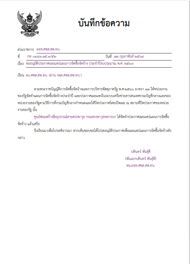 กองทัพบก โดยศูนย์ซ่อมสร้างสิ่งอุปกรณ์สายสรรพาวุธ กรมสรรพาวุธทหารบก ขอประกาศเผยแพร่แผนการจัดซื้อจัดจ้าง ประจำปีงบประมาณ พ.ศ ๒๕๖๙ ตามเอกสารที่แนบท้ายประกาศนี้