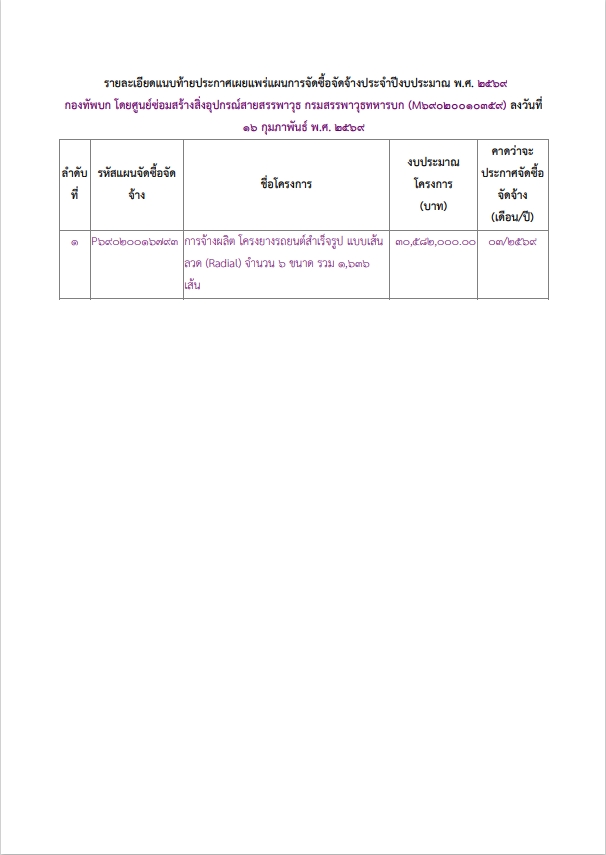 เรื่อง เผยแพร่แผนการจัดซื้อจัดจ้าง ประจำปีงบประมาณ พ.ศ. ๒๕๖๙ เรื่อง การจ้างผลิต โครงยางรถยนต์สำเร็จรูป แบบเส้นลวด (Radial) จำนวน ๖ ขนาด รวม ๑,๖๓๖ เส้น