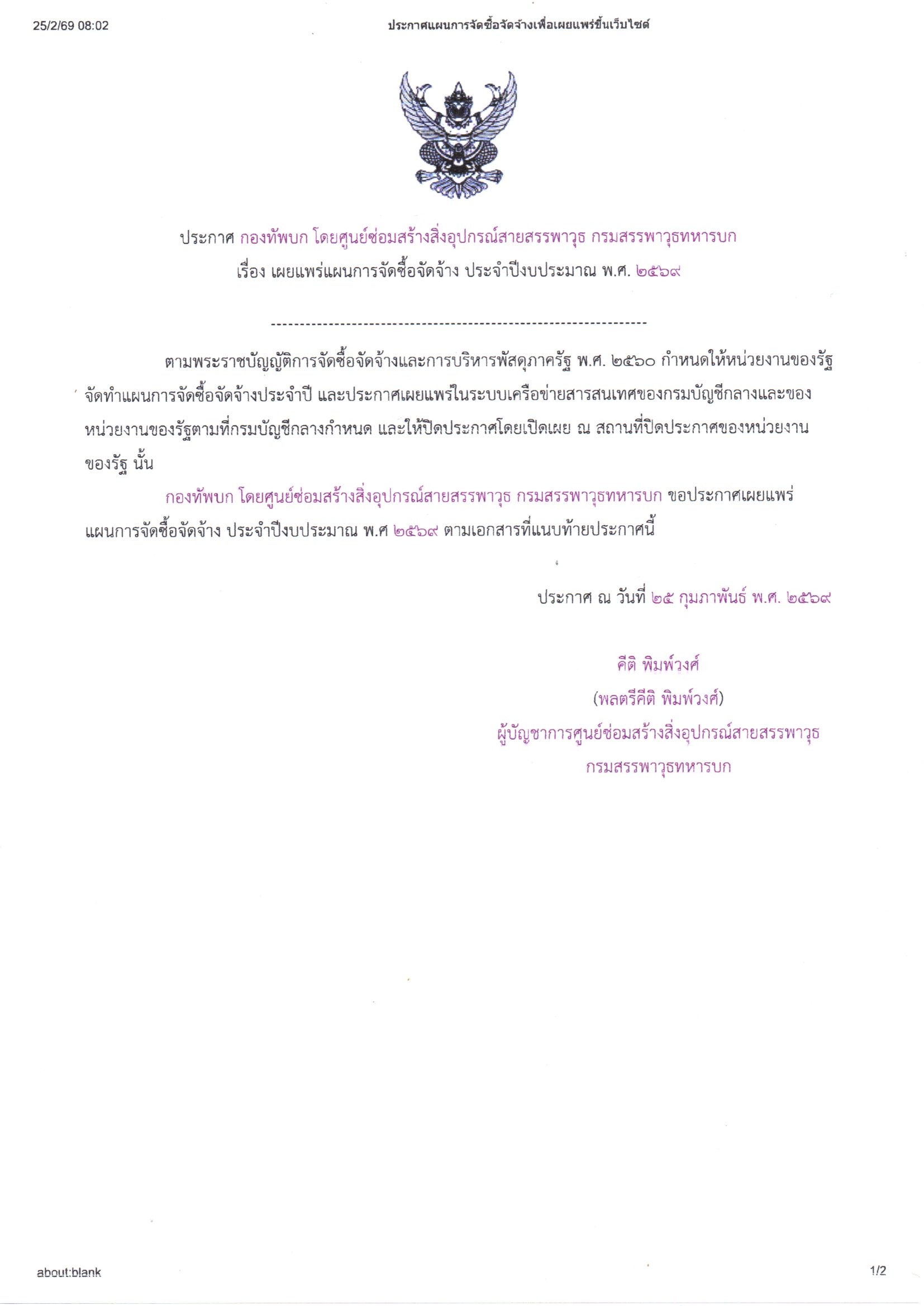 กองทัพบก โดยศูนย์ซ่อมสร้างสิ่งอุปกรณ์สายสรรพาวุธ กรมสรรพาวุธทหารบก ขอประกาศเผยแพร่แผนการจัดซื้อจัดจ้าง ประจำปีงบประมาณ พ.ศ. ๒๕๖๙ ตามเอกสารที่แนบท้ายประกาศนี้