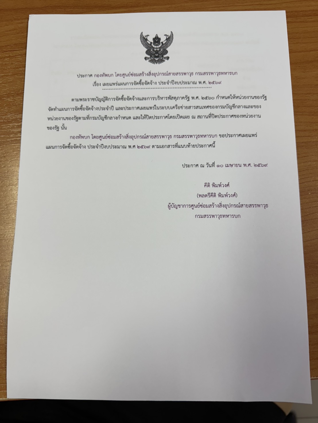 กองทัพบก โดยศูนย์ซ่อมสร้างสิ่งอุปกรณ์สายสรรพาวุธ กรมสรรพาวุธทหารบก ขอประกาศเผยแพร่แผนการจัดซื้อจัดจ้าง ประจำปีงบประมาณ พ.ศ. ๒๕๖๙ ตามเอกสารที่แนบท้ายประกาศนี้