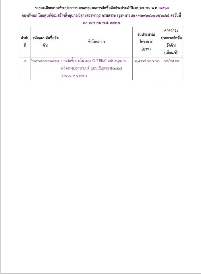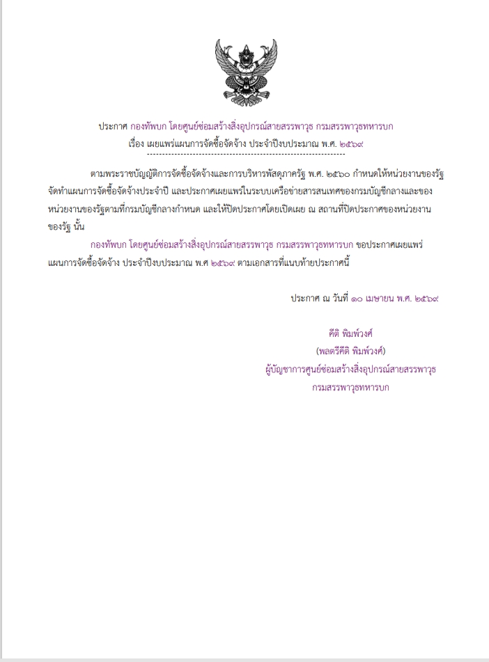 กองทัพบก โดยศูนย์ซ่อมสร้างสิ่งอุปกรณ์สายสรรพาวุธ กรมสรรพาวุธทหารบก ขอประกาศเผยแพร่แผนการจัดซื้อจัดจ้าง ประจำปีงบประมาณ พ.ศ ๒๕๖๙ ตามเอกสารที่แนบท้ายประกาศนี้