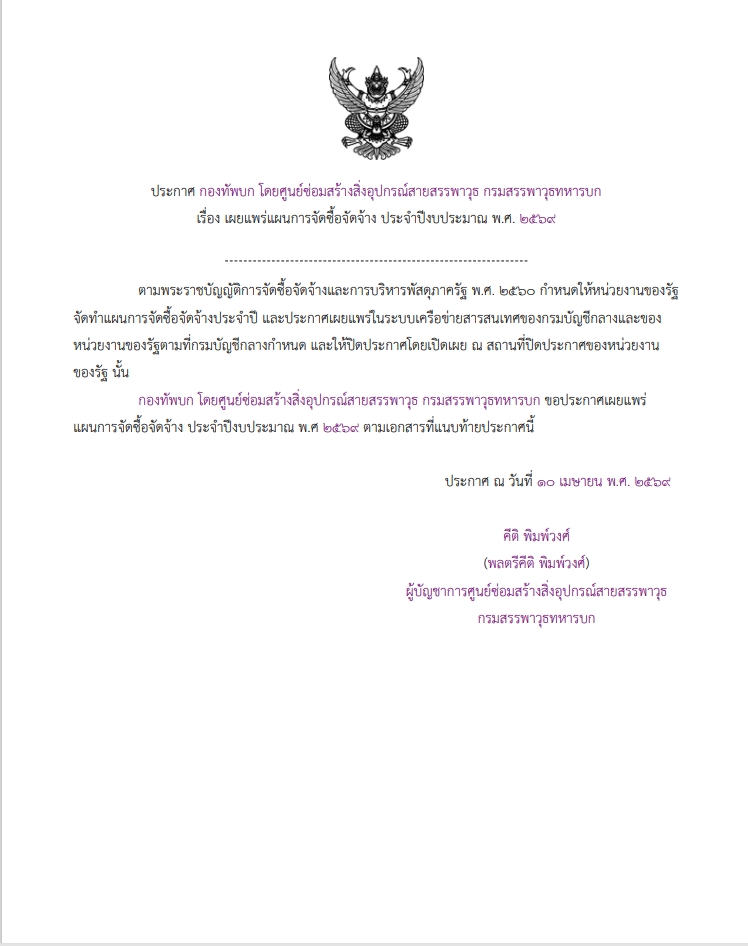 กองทัพบก โดยศูนย์ซ่อมสร้างสิ่งอุปกรณ์สายสรรพาวุธ กรมสรรพาวุธทหารบก ขอประกาศเผยแพร่แผนการจัดซื้อจัดจ้าง ประจำปีงบประมาณ พ.ศ ๒๕๖๙ ตามเอกสารที่แนบท้ายประกาศนี้