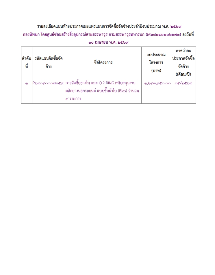 เรื่อง เผยแพร่แผนการจัดซื้อจัดจ้าง ประจำปีงบประมาณ พ.ศ. ๒๕๖๙ เรื่อง การจัดซื้อยางใน และ O – RING สนับสนุน งานผลิตยางนอกรถยนต์ แบบชั้นผ้าใบ (Bias) จำนวน ๔ รายการ