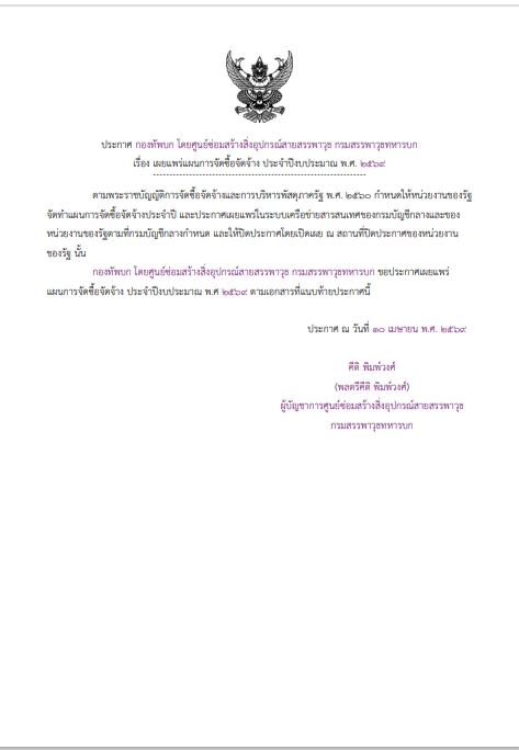 กองทัพบก โดยศูนย์ซ่อมสร้างสิ่งอุปกรณ์สายสรรพาวุธ กรมสรรพาวุธทหารบก ขอประกาศเผยแพร่แผนการจัดซื้อจัดจ้าง ประจำปีงบประมาณ พ.ศ ๒๕๖๙ ตามเอกสารที่แนบท้ายประกาศนี้