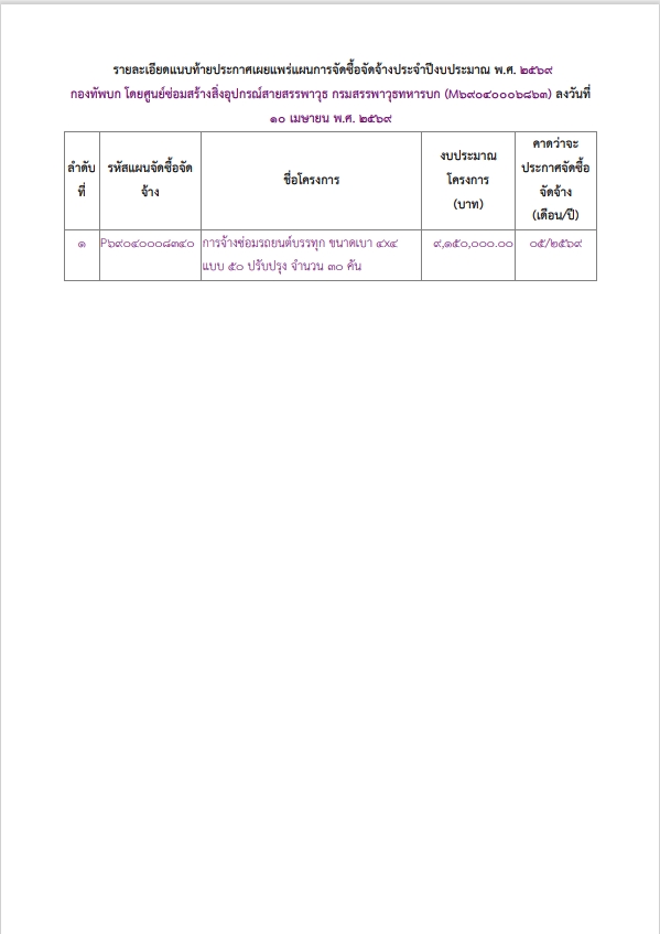 เรื่อง เผยแพร่แผนการจัดซื้อจัดจ้าง ประจำปีงบประมาณ พ.ศ. ๒๕๖๙ เรื่อง การจ้างซ่อมรถยนต์บรรทุก ขนาดเบา ๔x๔ แบบ ๕๐ ปรับปรุง จำนวน ๓๐ คัน