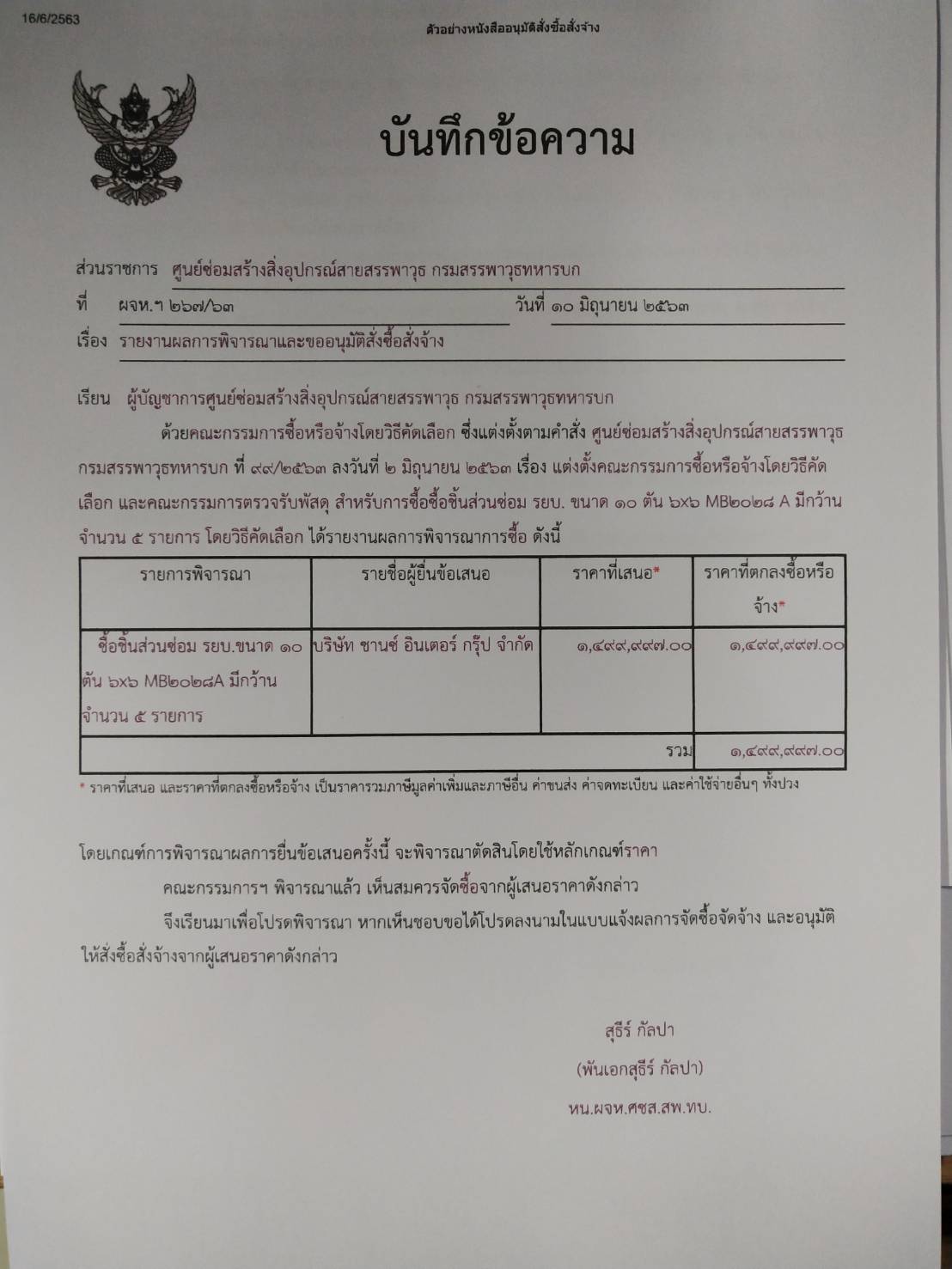ตามที่ กองทัพบก ได้มีหนังสือเชิญชวนสำหรับ ซื้อซื้อชิ้นส่วนซ่อม รยบ. ขนาด ๑๐ ตัน ๖x๖ MB๒๐๒๘ A มีกว้าน จำนวน ๕ รายการ โดยวิธีคัดเลือก นั้น